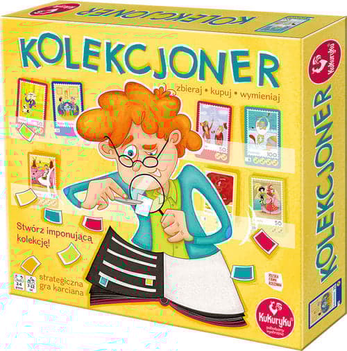 Kolekcjoner to gra strategiczna, w której będziecie kupować, sprzedawać i wymieniać znaczki. Gracze będą uzupełniać klasery znaczkami pochodzącymi z sześciu europejskich państw: Wielkiej Brytanii, Francji, Hiszpanii, Włoch, Holandii i Finlandii. Zwycięży filatelista, którego kolekcje osiągną najwyższą wartość na rynku! Gra zawiera: • 54 karty • 4 podwójne klasery • notes na punkty • instrukcję 2-4 graczy 7-12 lat