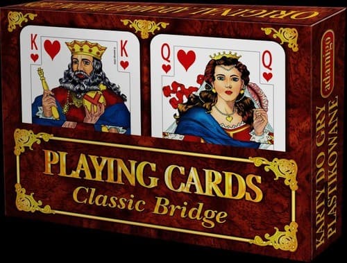 Komplet brydżowy to klasyczny zestaw karciany. Gra w karty uczy strategii, a jednocześnie rozwija zdolność logicznego myślenia. Karty wchodzące w skład kompletu, wykonane są starannie i są bardzo trwałe. Gra w karty to ciekawa rozrywka, w którą możesz grać ze znajomymi lub w gronie rodzinnym. Zestaw gry zawiera: - 2 talie po 54 karty w każdej, zapis brydżowy.