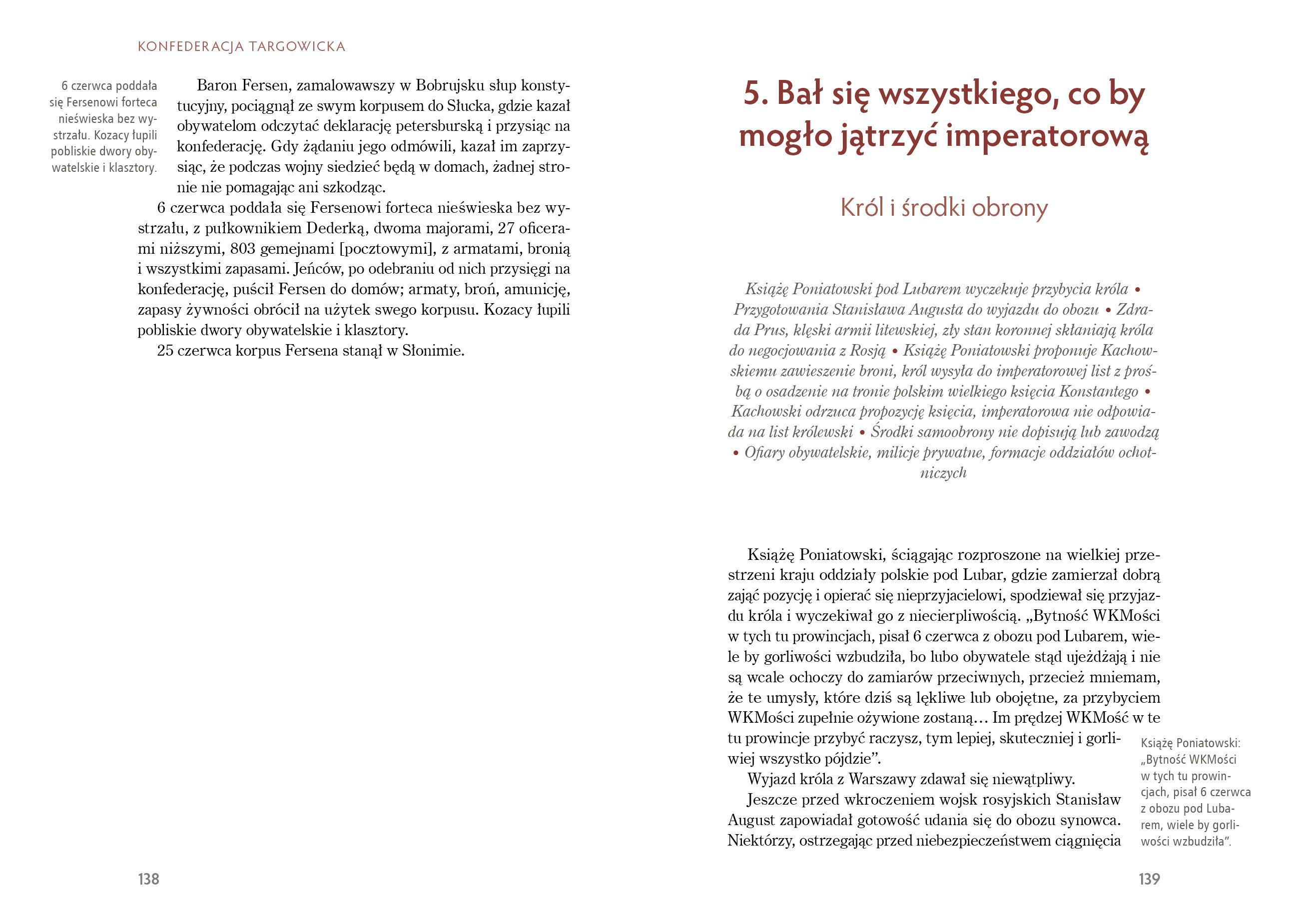 Targowiczanie wraz z Rosjanami udawali, że nie ma żadnej wojny, choć dywizje carskie przekroczyły granice Rzeczypospolitej w kilku miejscach i maszerowały w głąb kraju, zwalczając wszelki opór, tocząc bitwy i grabiąc mienie. Bez tego wsparcia militarnego Targowica by nie zaistniała. W ogóle bez różnorodnego wsparcia z zagranicy konfederacja nie miała szans powodzenia. Zwracając się o pomoc cudzoziemską, z całą świadomością rezygnowali z niepodległości kraju. Uszczęśliwiali ojczyznę rozlewem krwi bratniej, brutalnością wojsk cudzoziemskich, które kazali poczytywać za przyjacielskie – pisze Autor. Targowiczanie podstępnie przedstawiali się jako najszczersi patrioci! Likwidowali swobody – w imię swobód. Jakże dobrze to dziś znamy.