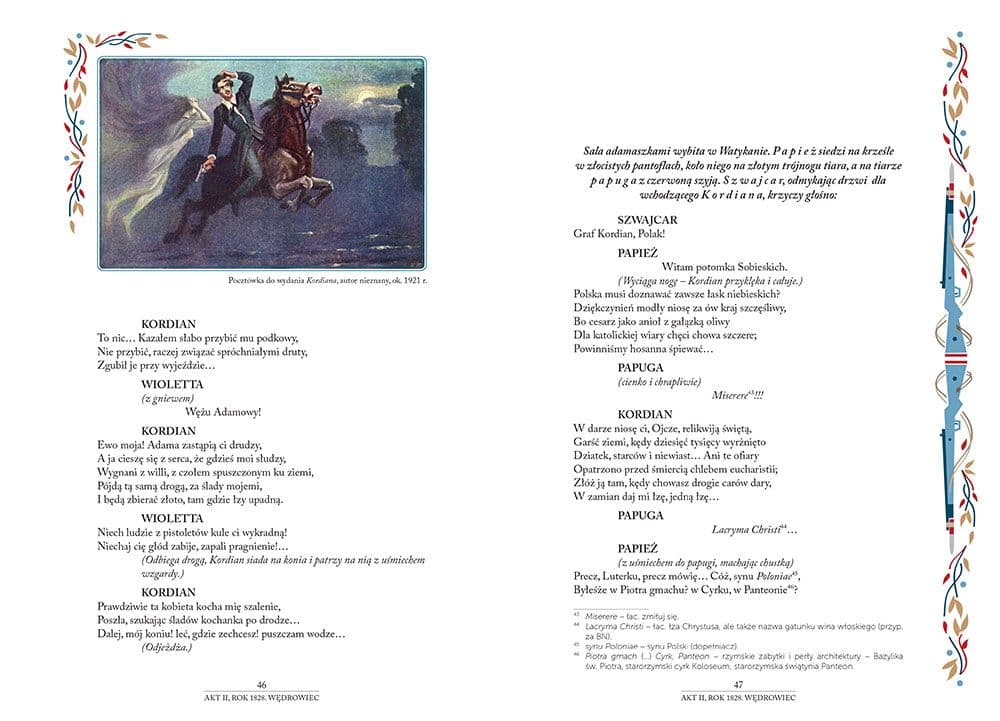 Kordian - lektura wybrana do Narodowego Czytania w 2024 roku - w zupełnie nowym, pięknym wydaniu! Ciemna grudniowa noc - w chacie czarnoksiężnika zbierają się Szatan, Diabły i Czarownice, by przyrządzić prawdziwie diabelską mieszankę, z której wyłaniają się przywódcy powstania listopadowego. Czy Kordian, młodzieniec wrażliwy, egzaltowany i gotowy zabić się dla miłości w kluczowym momencie poświęci się, by ratować Polskę przed okrutnymi zaborcami i nieudolnymi przywódcami? Czy zdoła udźwignąć na barkach ciężar narodu? Polska Winkelriedem narodów! Kordian, dotąd nieszczęśliwie zakochany, emocjonalny i rozczarowany rzeczywistością, znajduje cel - zabije cara i, niczym mityczny bohater Winkelried, zginie, by ratować naród. Czy jednak jego misja się powiedzie? Tego nowym czytelnikom nie możemy zdradzić, gwarantujemy jednak, że po poznaniu tej historii jeszcze wiele razy będą do niej wracać! Zaopatrz się w swój egzemplarz na Narodowe Czytanie! Kordian, jeden z najbardziej znanych dramatów Juliusza Słowackiego, to historia, która nigdy nie traci na wartości, co potwierdza również to, że już w tym roku będziemy czytać ją wspólnie podczas Narodowego Czytania! Rozterki bohatera są wciąż aktualne, a konflikt, przed którym staje Kordian - uniwersalny. Ponadczasowy klasyk w nowym wydaniu z pięknymi ilustracjami Wielu z nas świetnie zna tekst Kordiana, jednak dzięki nowemu, pięknemu wydaniu, nawet kolejna lektura będzie wspaniałą rozrywką. Wydanie Kordiana w serii Kolorowa Klasyka łączy nowoczesność z klasyką, dlatego znajdą się w nim zarówno XIX-wieczne dzieła sztuki służące za ilustracje, jak i wyrazista, graficzna okładka w żywych kolorach. Serdecznie zachęcamy do lektury!