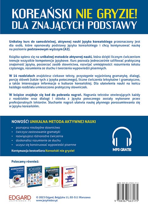 Koreański nie gryzie! Dla znających podstawyto unikalny kurs do samodzielnej, aktywnej nauki języka koreańskiego przeznaczony dla osób, które opanowały podstawy języka koreańskiego i chcą kontynuować naukę na poziomie podstawowym wyższym (A2).