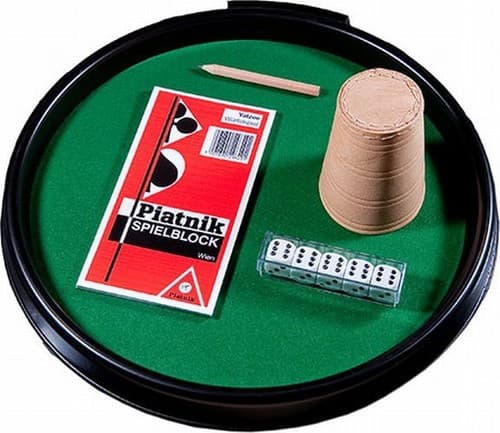 Zestaw do gry w kości składający się z 5 kostek do gry, tacki, kubka, ołówka i bloczka do zapisu. Doskonały na prezent. Wiek graczy: 3+