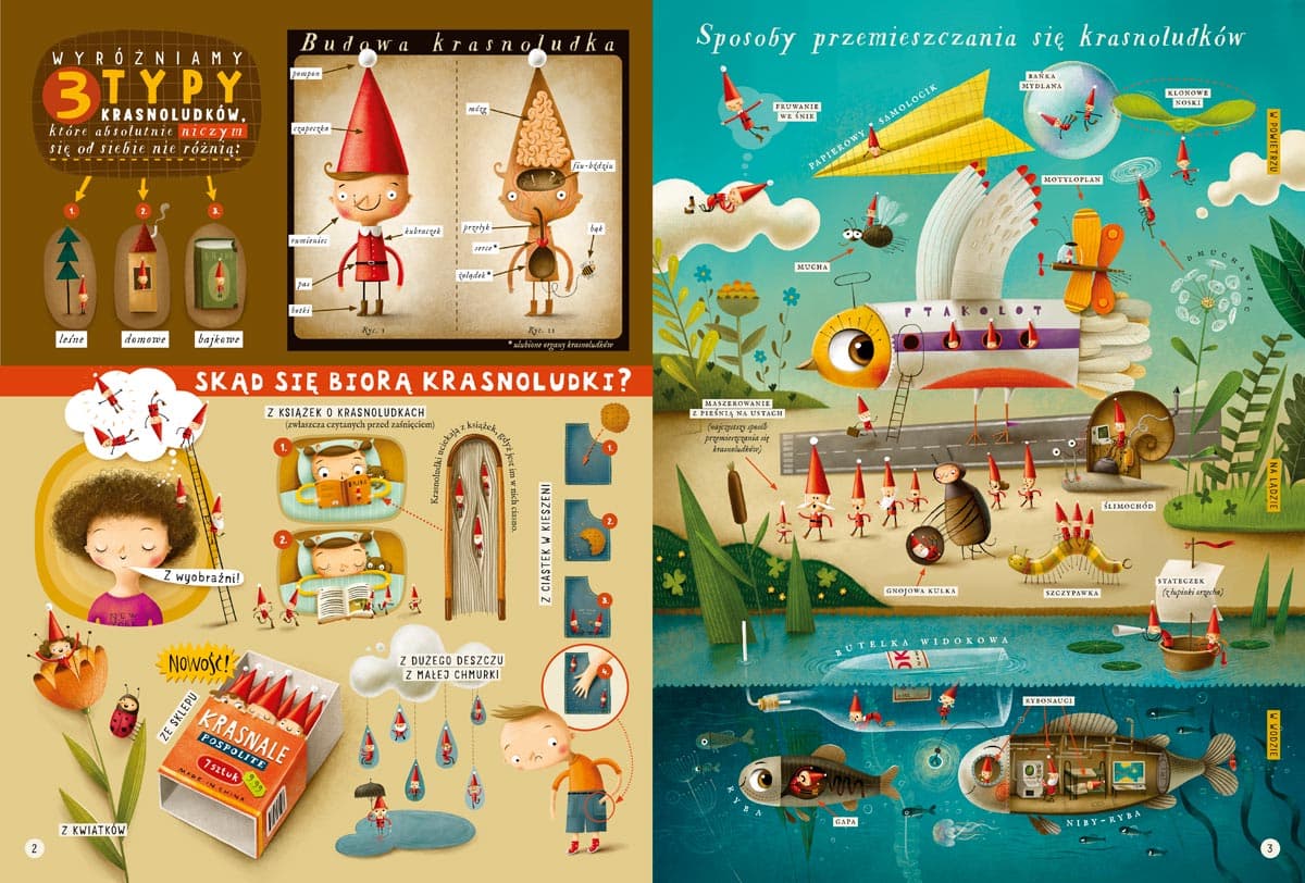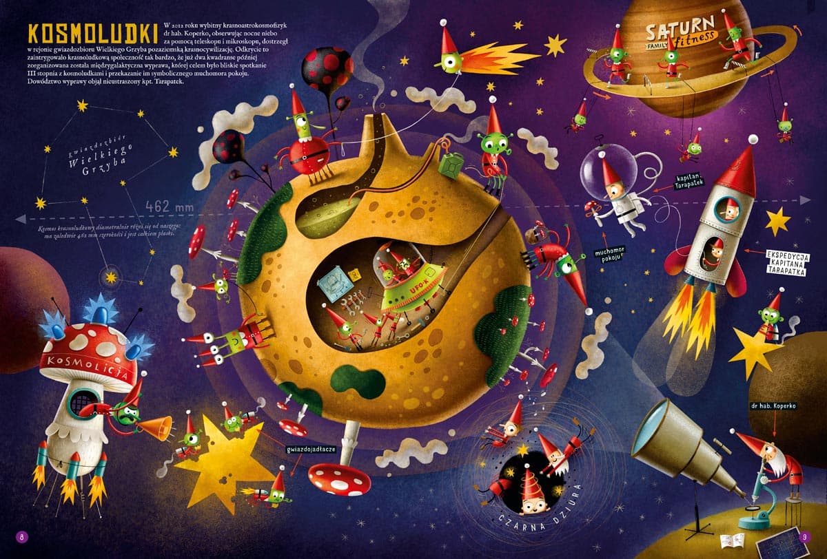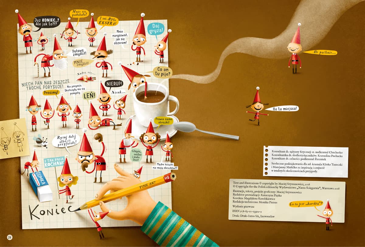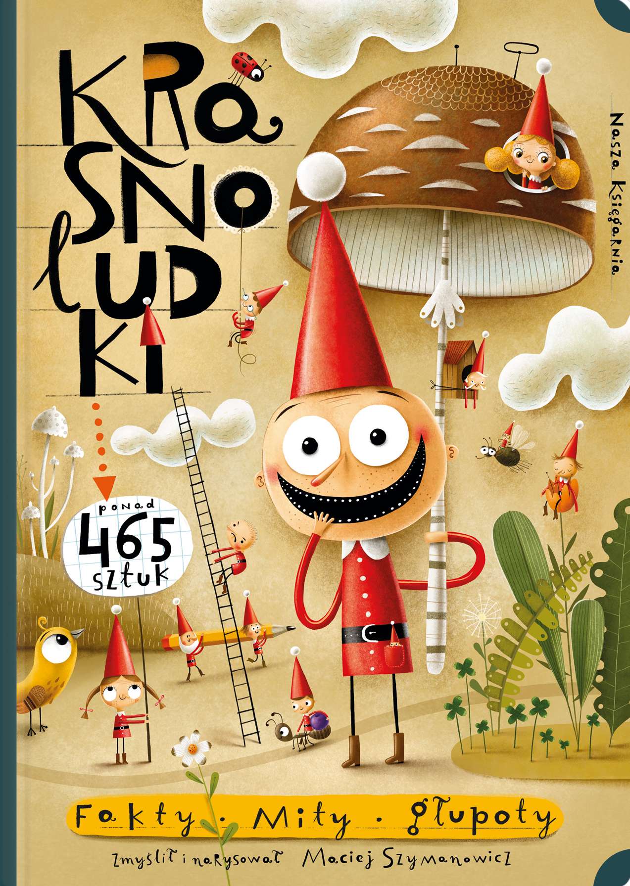 Niezwykły zbiór informacji na temat krasnoludków! Skąd się biorą i jak przemieszczają? Gdzie mieszkają i co mają w środku? Co jedzą i co robią w wolnych chwilach? Jakie sporty uprawiają? W których dziedzinach odnoszą największe sukcesy? I wiele, wiele więcej o krasnoludkach domowych, leśnych, bajkowych, porannych, a nawet doniczkowych. Na szczegółowych ilustracjach obejrzycie między innymi ślimochód, wyścigi w miodzie po chlebku z twarożkiem, człowieka zakażonego krasnoludozą, niezwykłą wspinaczkę na słodkotysięcznik, a nawet bliskie spotkanie III stopnia z kosmoludkami. Dowiecie się, dlaczego giną smartfony, skąd naprawdę biorą się dziury w serze, dlaczego w mieszkaniu ciągle się kurzy i czy psy rzeczywiście szczekają bez powodu. Maciej Szymanowicz (ur. 1976) – w dzieciństwie kochał rysować, ale studiować postanowił na białostockim wydziale lalkarskim Akademii Teatralnej. Został aktorem lalkowym, ale to zajęcie nie przypadło mu do gustu. Powrócił do miłości z dzieciństwa. Ilustruje, projektuje książki, tworzy plakaty teatralne i gry planszowe. W 2014 wydał autorską książkę „Najmniejszy słoń świata”. Za ilustracje do książki „Asiunia” otrzymał Nagrodę Miasta Stołecznego Warszawy (2011), a za „Wszystkie moje mamy” nagrodę w konkursie Przecinek i Kropka oraz nagrodę Festiwalu Literatury dla Dzieci (2014). Powyższy opis pochodzi od wydawcy.Szczegółowe informacje na temat książki Krasnoludki. Fakty, mity, głupoty