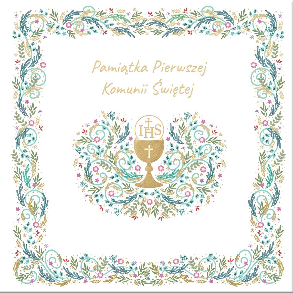 Książeczka Komunijna w formacie 21,5 x 21,5 cm.