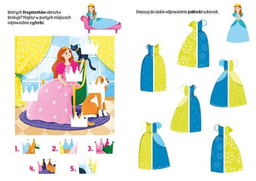Książka wzbogaca ZASÓB SŁOWNICTWA, utrwala WIADOMOŚCI I UMIEJĘTNOŚCI, poszerza WIEDZĘ, ćwiczy SPOSTRZEGAWCZOŚĆ, doskonali KOORDYNACJĘ WZROKOWO-RUCHOWĄ. Do nauki zachęcają sympatyczne księżniczki.
