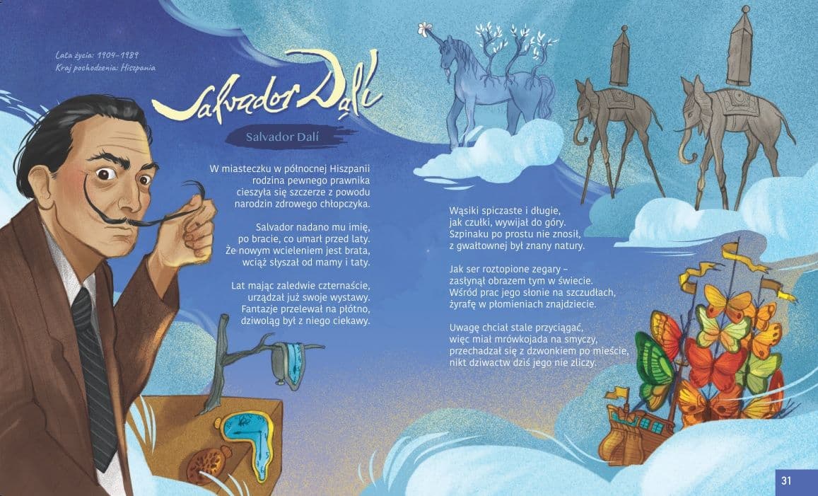 Ilustracje są utrzymane w KLIMACIE DZIEŁ danego artysty. CIEKAWE WYDARZENIA z życia twórców i ich NIEZWYKŁE DOKONANIA są przedstawione w lubianej przez dzieci RYMOWANEJ FORMIE. Wiersze, napisane przystępnym językiem, mają BOGATĄ WARTOŚĆ MERYTORYCZNĄ i zawierają mnóstwo ciekawostek.