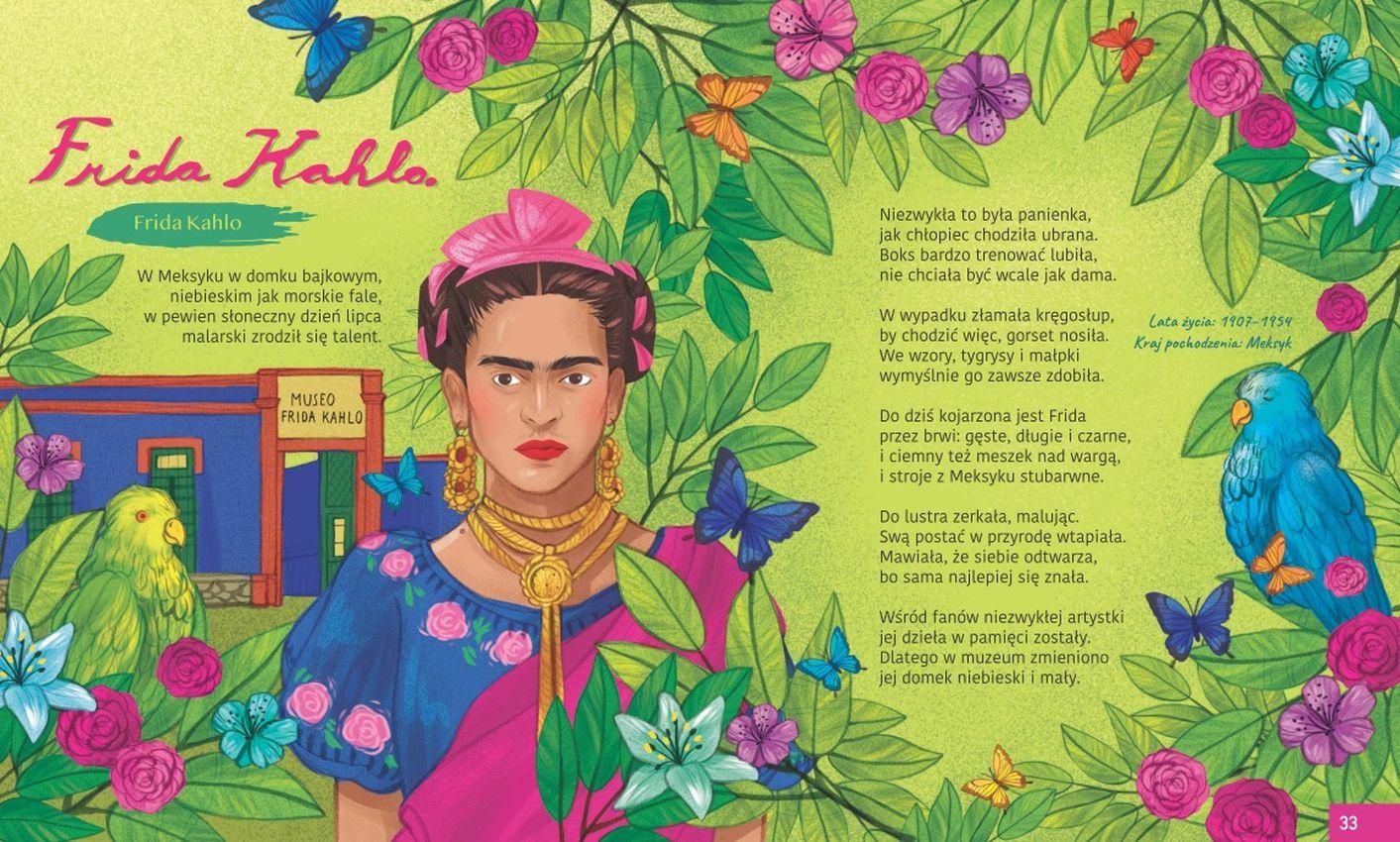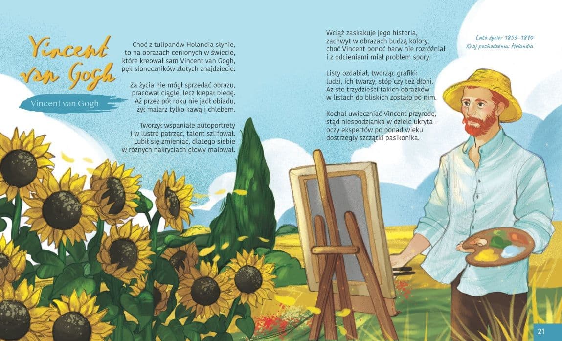 Książka przedstawia 20 cenionych twórców OD CZASÓW RENESANSU PO WSPÓŁCZESNOŚĆ. Znalazły się tu m.in. takie postaci, jak: Vincent van Gogh, Jan Matejko, Frida Kahlo, Andy Warhol, Magdalena Abakanowicz czy Banksy. Każda rozkładówka to ODDZIELNA OPOWIEŚĆ i WIZUALNA PRZYGODA, dzięki czemu publikacja jest niezwykle RÓŻNORODNA.