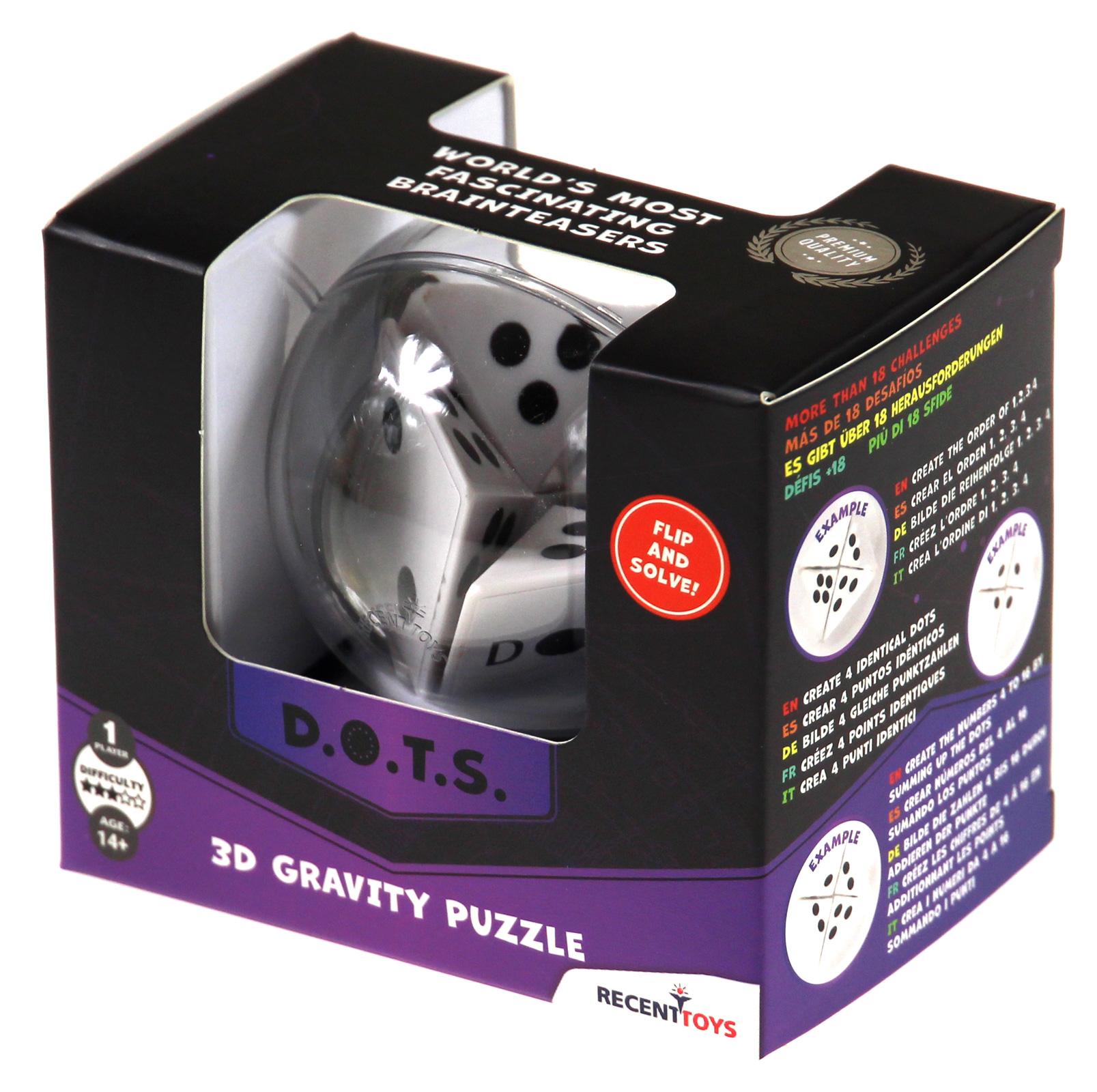Prezentowana łamigłówka 3D opiera się na grawitacji. Odwróć szklaną kulkę, aby wygenerować kombinacje liczb od 4 do 16. Gdy już opanujesz tę ekscytującą łamigłówkę, sprawdź swoją szybkość w jej rozwiązywaniu. Czeka na ciebie ponad 18 wyzwań, m.in.:- utwórz liczby od 4 do 16, sumując kropki- utwórz cztery takie same ścianki (4x1, 4x2 itd.)- utwórz kolejność 1, 2, 3, 4Recent Toys to producent łamigłówek z Holandii. Jak sami o sobie mówią: „Tworzą zagadki dla wszystkich.” Jeżeli lubisz matematykę, logikę, układanie wzorów lub po prostu jesteś cierpliwy i wytrwały, to na pewno znajdziesz coś dla siebie! Choć wszystkie łamigłówki są unikatowe to mają one następujące cechy wspólne:1. Prostota – zagadki są łatwe do wytłumaczenia. Nasz umysł ma się skupić na rozwiązaniu łamigłówki, a nie na zrozumieniu zasad. 2. Mądrość – łamigłówki są zaprojektowane tak, aby zmusić nasz umysł do poszerzenia horyzontów i otwarcia na nowe pomysły. 3. Wytrzymałość – łamigłówki zbudowane są z odpowiednich materiałów. Elementy można przesuwać z wyjątkową łatwością. Chodzą płynnie, szybko i się nie zacinają.Podejmij wyzwanie! Popraw kondycję swojego umysłu!ZAWARTOŚĆ:łamigłówka D.O.T.S. (średnica: 7 cm)