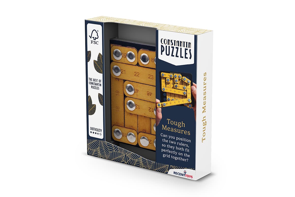 Czy potrafisz tak ułożyć dwie linijki, aby idealnie zapełniły wszystkie pola podstawy? W niektórych miejscach, linijki będą się na siebie nakładać (obie mogą znaleźć się zarówno na górze jak i na dole). Jeśli potrzebujesz pomocy, mała podpowiedź: spróbuj zacząć układanie od numeru 50, umieszczonego w dowolnym rogu. Czy uda Ci się zmierzyć... odnaleźć rozwiązanie?Jean Claude Constantin jest niewątpliwie jednym z najbardziej zapracowanych projektantów łamigłówek ostatnich trzydziestu lat. Wyjątkowe i różnorodne pomysły, które powstają w jego głowie, przemieniają się w unikalne i wizualnie zachwycające projekty. Łamigłówki Jean Claude'a uznawane są za bardzo wymagające. Aby je rozwiązać, będziesz potrzebował dużej aktywności szarych komórek, odpowiedniej koncentracji i odrobiny wyobraźni.Recent Toys to producent łamigłówek z Holandii. Jak sami o sobie mówią: „Tworzą zagadki dla wszystkich.” Jeżeli lubisz matematykę, logikę, układanie wzorów lub po prostu jesteś cierpliwy i wytrwały, to na pewno znajdziesz coś dla siebie! Choć wszystkie łamigłówki są unikatowe to mają one następujące cechy wspólne:1. Prostota – zagadki są łatwe do wytłumaczenia. Nasz umysł ma się skupić na rozwiązaniu łamigłówki, a nie na zrozumieniu zasad. 2. Mądrość – łamigłówki są zaprojektowane tak, aby zmusić nasz umysł do poszerzenia horyzontów i otwarcia na nowe pomysły. 3. Wytrzymałość – łamigłówki zbudowane są z odpowiednich materiałów. Elementy można przesuwać z wyjątkową łatwością. Chodzą płynnie, szybko i się nie zacinają.Podejmij wyzwanie! Popraw kondycję swojego umysłu!ZAWARTOŚĆ:łamigłówka Tough Measures (wymiary: 12,5x11x1,5 cm)książeczka
