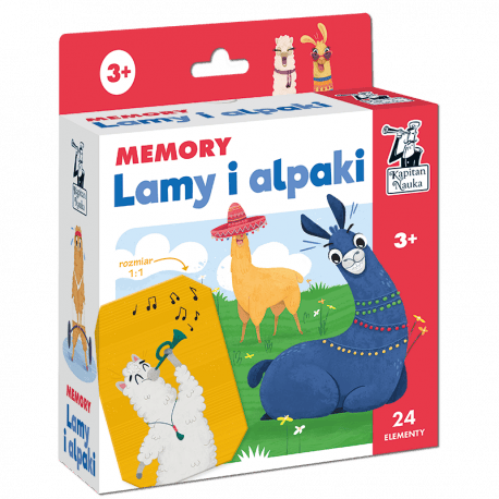 „Memory Lamy i alpaki” (3+) to jedna z najprostszych, a zarazem najbardziej rozwijających gier edukacyjno-rozrywkowych dla przedszkolaków i młodszych uczniów. Idealnie łączy trening pamięci z atrakcyjną tematyką. Jej bohaterami są uwielbiane przez dzieci alpaki i lamy. Te niezwykle ciekawe świata i towarzyskie zwierzęta zostały przedstawione w pełen humoru sposób, tak aby utrzymać uwagę i zainteresowanie dzieci rozgrywką, a także rozbawić je i pozwolić na swobodną pracę wyobraźni. „Memory Lamy i alpaki” (3+) stwarza mnóstwo możliwości zabaw. Poznajcie wesołe alpaki i lamy, m.in. zmotywowane sportsmenki, wytrawne czytelniczki oraz wielbicielki mody. Dopasujcie kafelki przedstawiające te same pary zwierząt w różnych pozach, opowiadajcie o ich przygodach, ćwicząc w ten sposób pamięć, koncentrację, spostrzegawczość, a także wyobraźnię. Przyjrzyjcie się uważnie wszystkim zwierzętom, odkryjcie, czym różnią się alpaki od lam, oraz spróbujcie określić ich usposobienie. Dzięki prostym zasadom memory sprawdzi się także w zabawach z młodszymi przedszkolakami. Barwne ilustracje Katarzyny Nowakowskiej wprowadzają dziecko w świat zwierząt ukazanych w pełen humoru sposób. Zachęcają je tym samym do zabawy i angażują uwagę. Kafelki do gry zostały wykonane z grubej tektury, co gwarantuje bezpieczną zabawę oraz wytrzymałość nawet podczas najbardziej emocjonujących rozgrywek. Rozwój pamięć, koncentracja, spostrzegawczość, wyobraźnia Ilustratorka Katarzyna Nowakowska – ilustratorka książek i gier planszowych dla dzieci, projektantka graficzna, autorka plakatów oraz patternów odzieżowych. W serii również Memory Afryka 3+ Memory Dinozaury 3+ Memory Na wsi 3+ Memory Ocean 3+ Memory Pojazdy 3+
