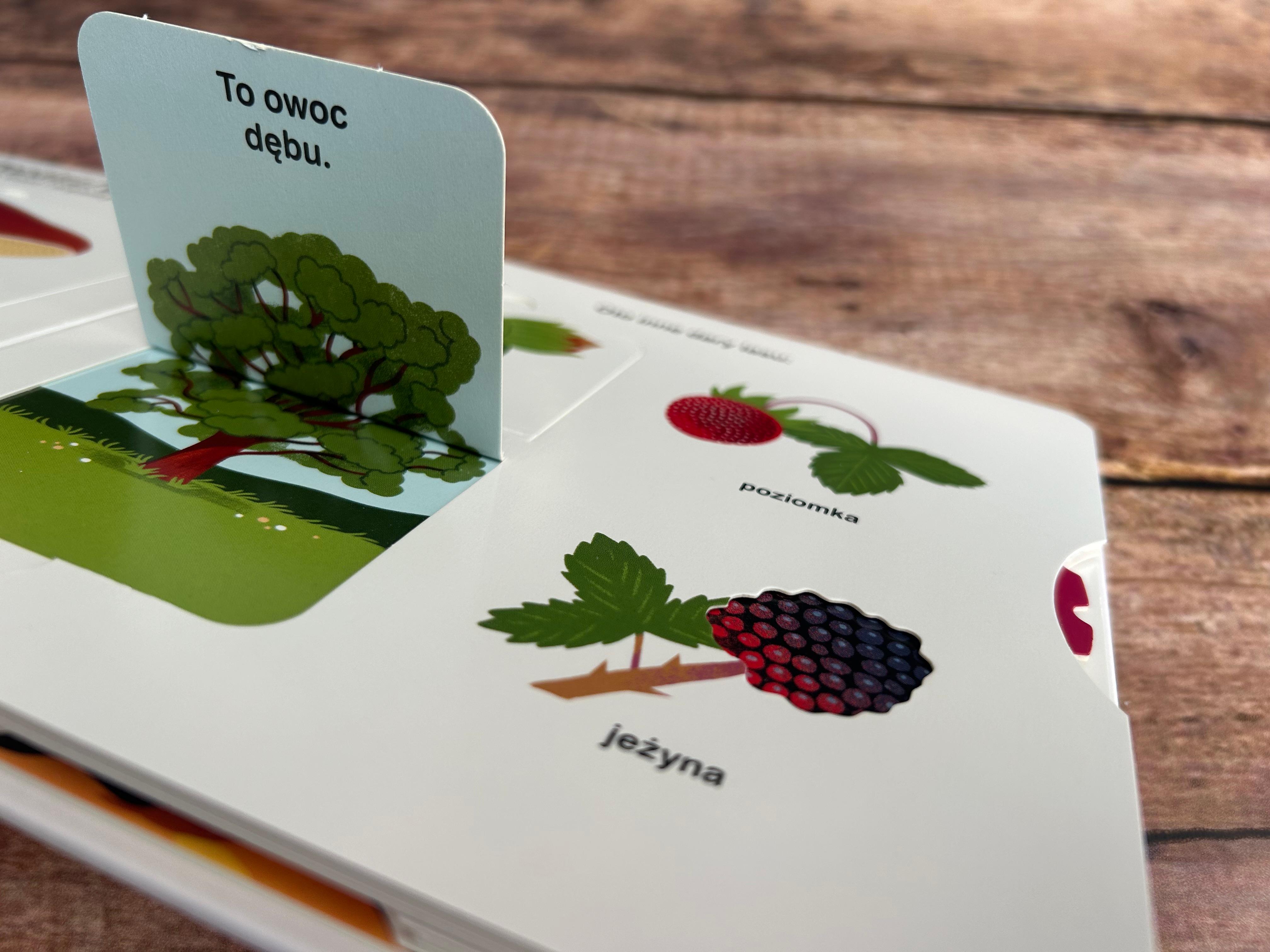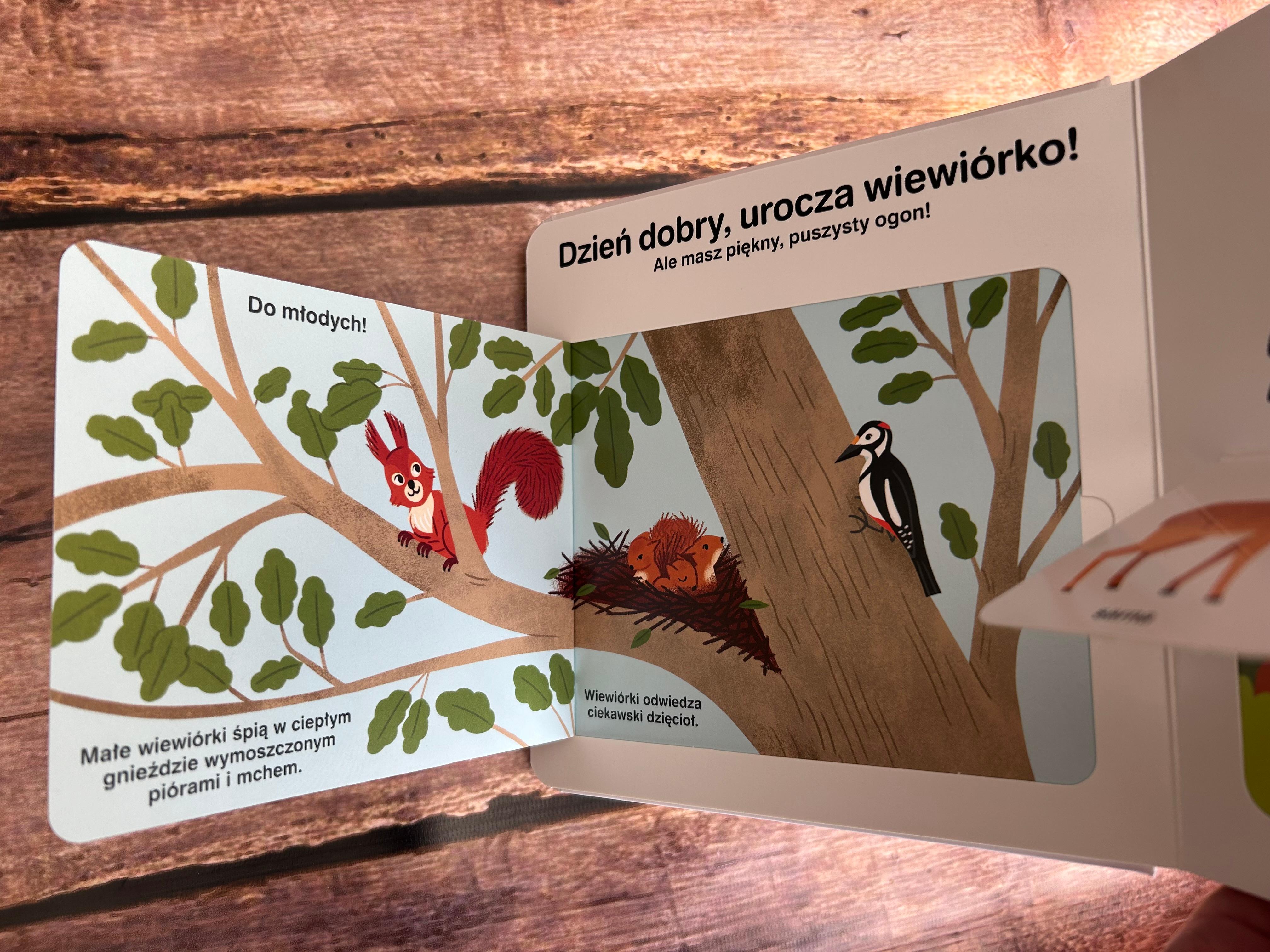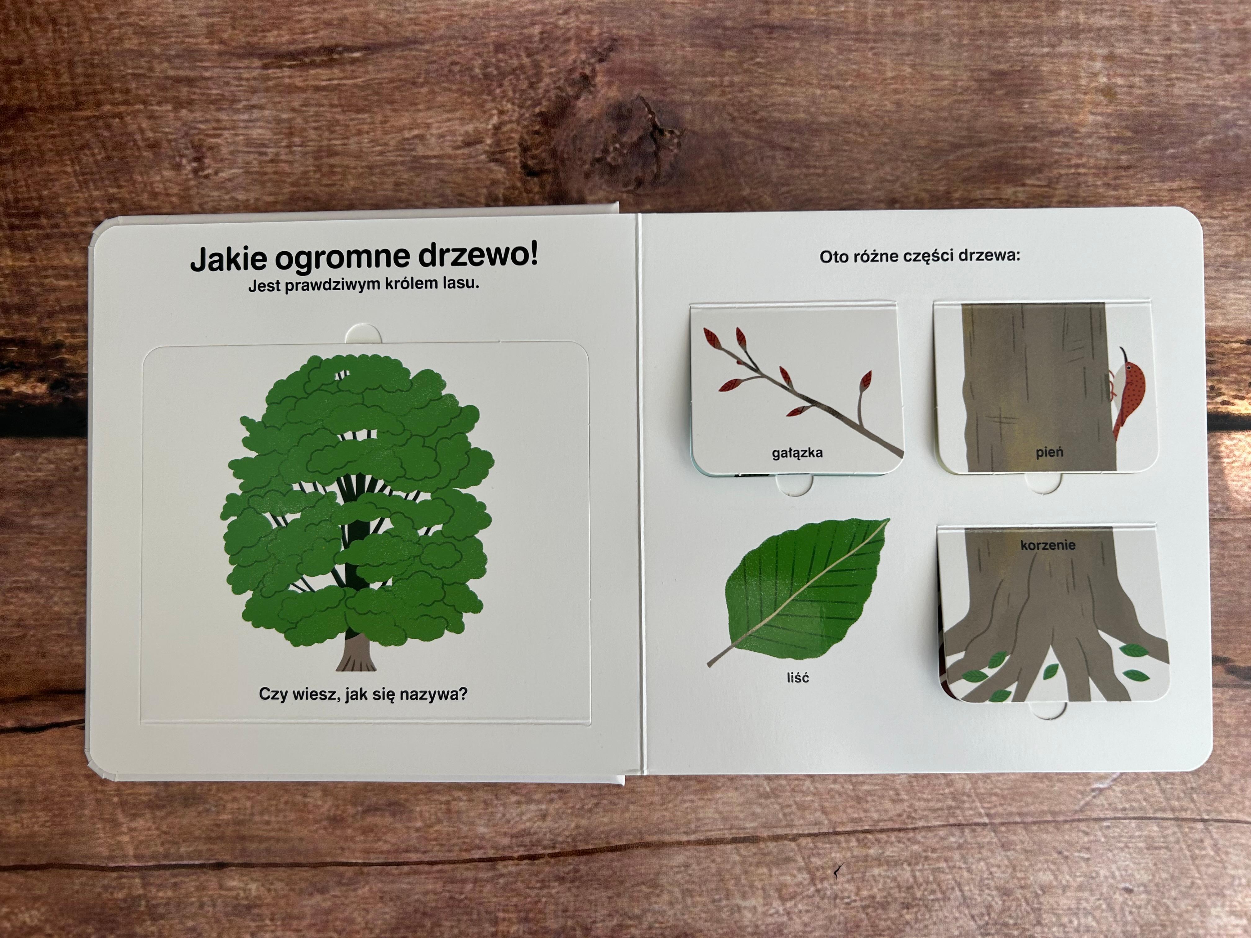 Książeczka Las uczy nas o różnorodności lasu, dodatkowo ma liczne okienka, które po otworzeniu zawierają dodatkowe ciekawostki.