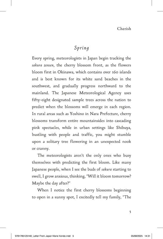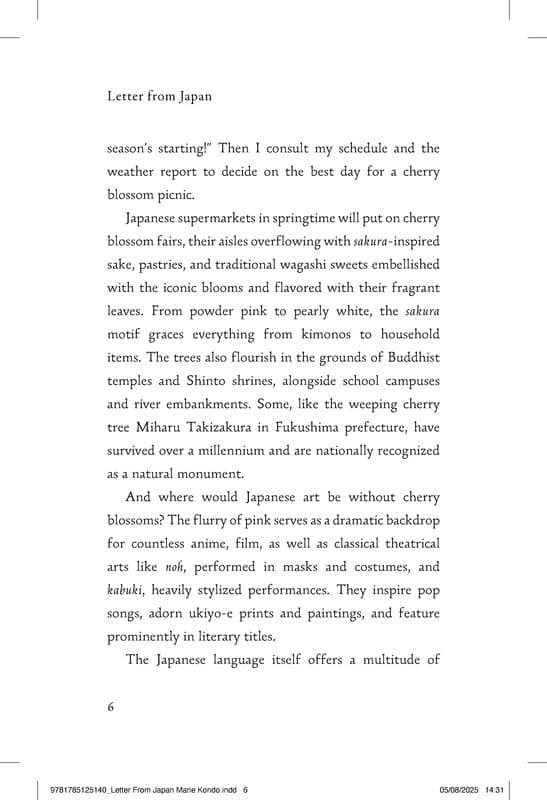 Escape to Japan with Marie Kondo's Letter from Japan, the new book for anyone who wants to bring calm, wonder and beauty to their life through Japanese culture - the perfect gift this autumn.In her brand new book Marie Kondo, bestselling author of The Life Changing Magic of Tidying Up, reveals the aspects of Japanese culture that are intrinsic to a lifestyle full of calm, wonder and beauty. Through six chapters - Cherish, Perfect, Consider, Harmonise, Purify, and Savour - we learn about the guiding principles that define the values that flow through the arts, rituals, and sensibilities of Japan, and by which Marie leads her life. We discover why appreciating the beauty of sakura, cherry blossom, allows for a moment to deeply experience a season through a single entity (Cherish). In the traditional tea ceremony, we see the importance of kiwameru, the Japanese word for achieving mastery or perfection (Perfect). In umami, we taste how something simple and delicious can nourish the heart (Savour). We explore why the things left unsaid, ma, are just as important as the words we say (Harmonise). Above all, we learn how recognising these moments - the ones that bring happiness and fulfilment - can lead to a more satisfying and joyful life. The beautiful hardback edition, which will includes foiling on the cover and illustrated pages, will make the perfect gift this autumn.Szczegółowe informacje na temat książki Letter From Japan