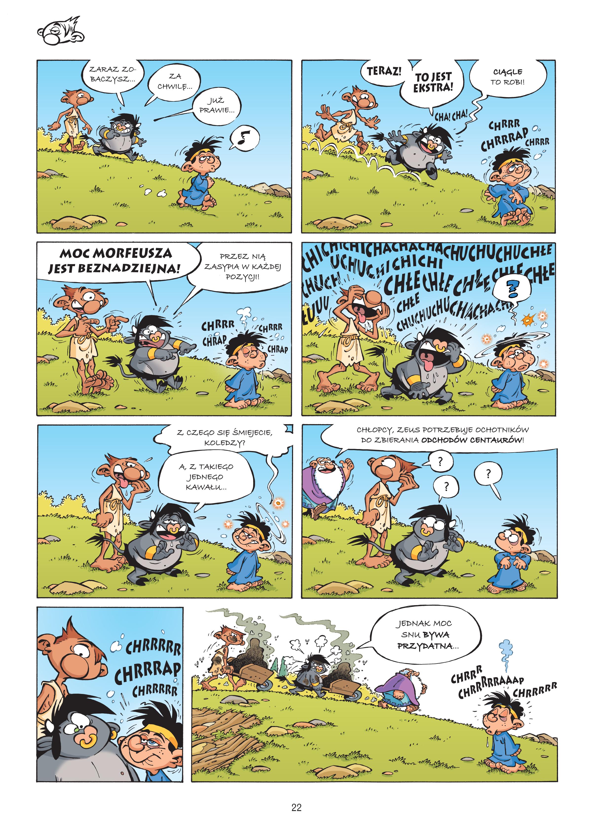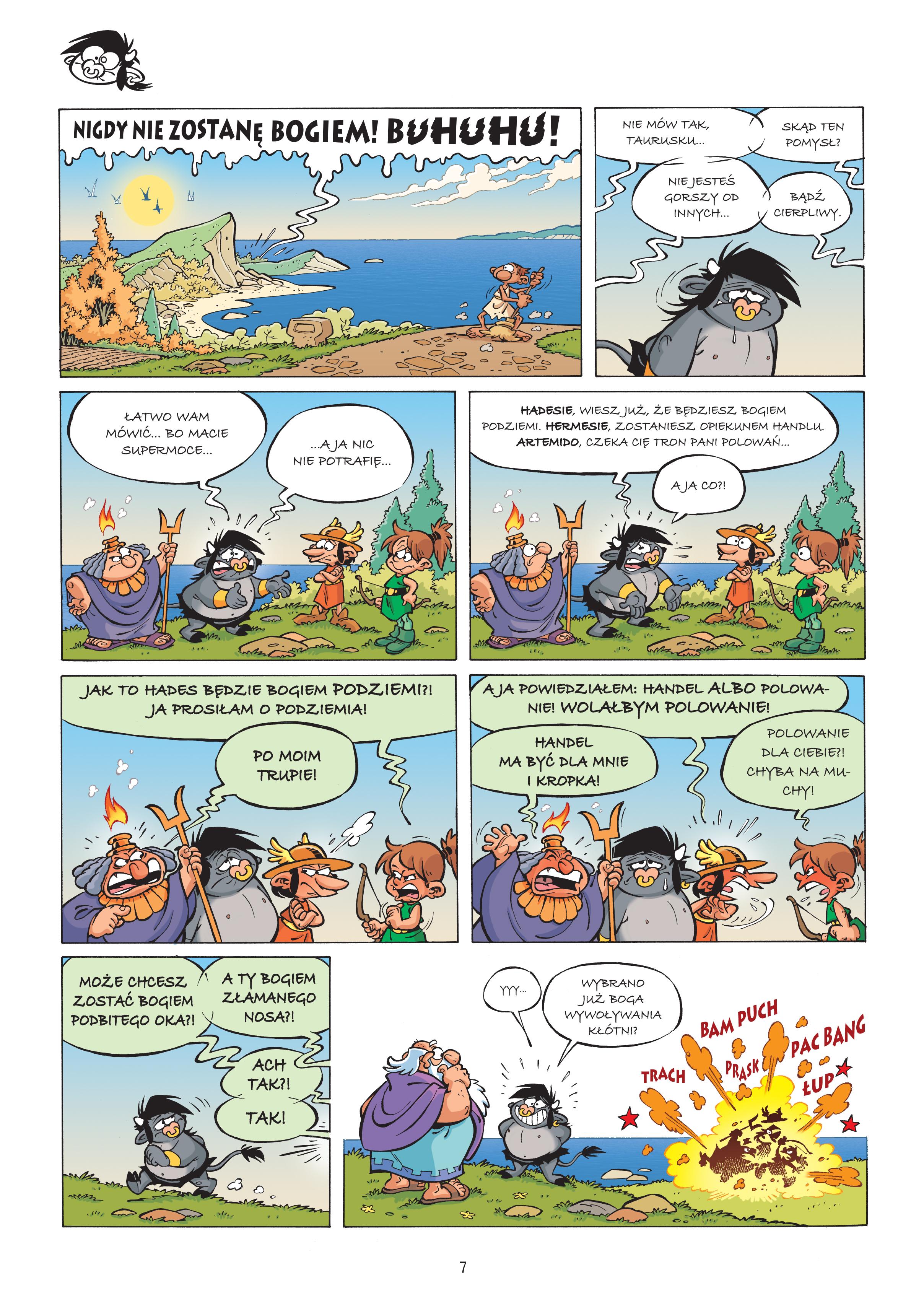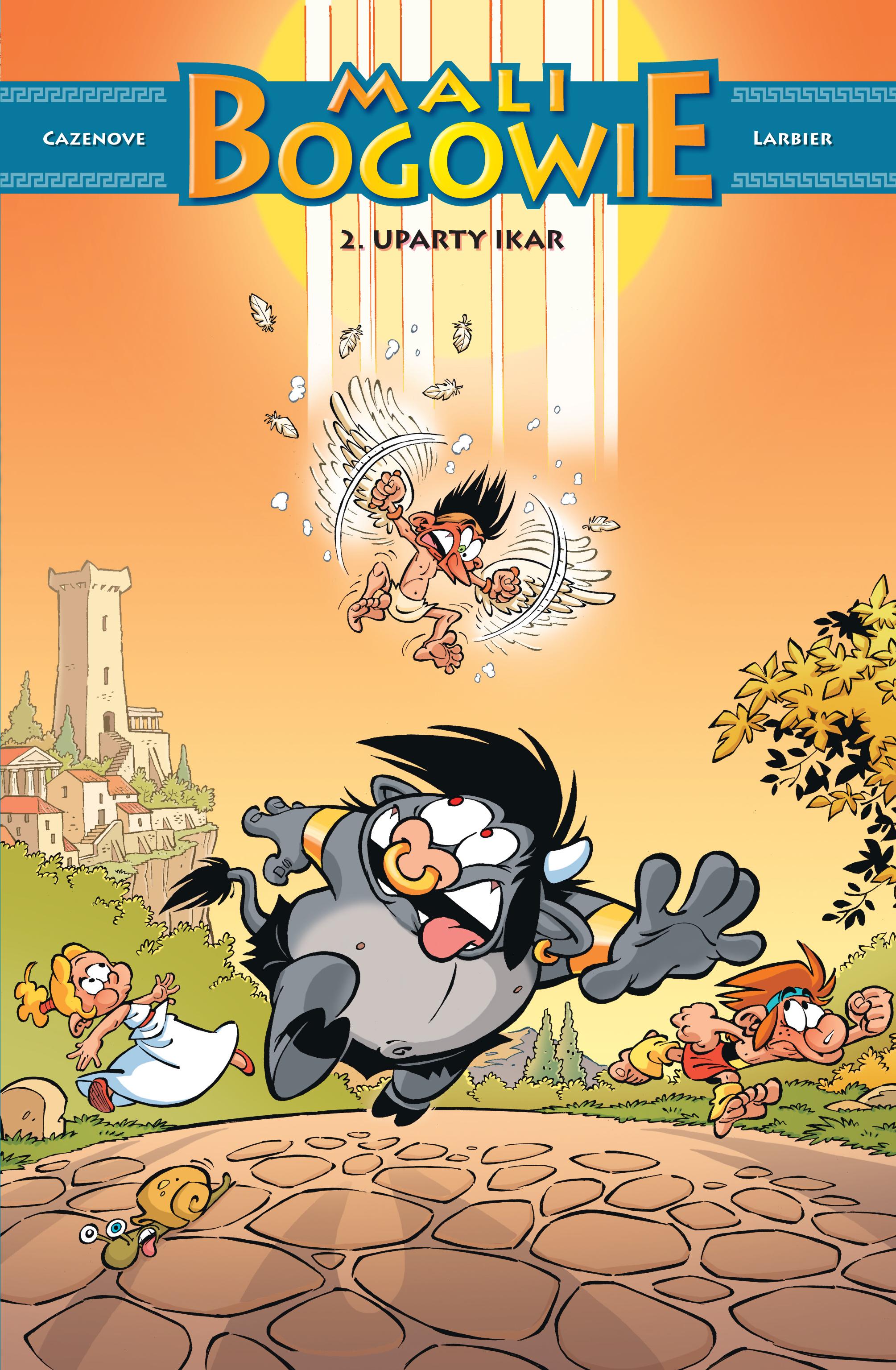 Drugi tom humorystycznej historii z czasów mitycznej Grecji o kandydatach na mieszkańców Olimpu! Niektórzy z małych bohaterów już wiedzą, że dzięki nadnaturalnym darom zostaną bogami i herosami, ale muszą jeszcze przejść trudny staż, jak chcąca zostać boginią wojny Atena... Są jednak i tacy, którzy dopiero czekają na ujawnienie się ich mocy. Atlas wierzy, że będzie olbrzymi jak jego przodkowie Tytani, Ikar uparcie próbuje latać niczym kaczka, a Herakles na razie tylko z daleka przygląda się potworom. Z kolei największym osiągnięciem Tauruska jest robienie niewybrednych kawałów... Autorami historii o psotnych bogach są scenarzysta Christophe Cazenove, znany w Polsce z bestsellerowej serii „Sisters”, oraz rysownik Philippe Larbier, który stworzył ilustracje do takich humorystycznych opowieści jak „Chats, chats, chats” czy „Ninja” oraz scenariusz kryminalnego cyklu dla dzieci „Les Enigmes de Léa”.