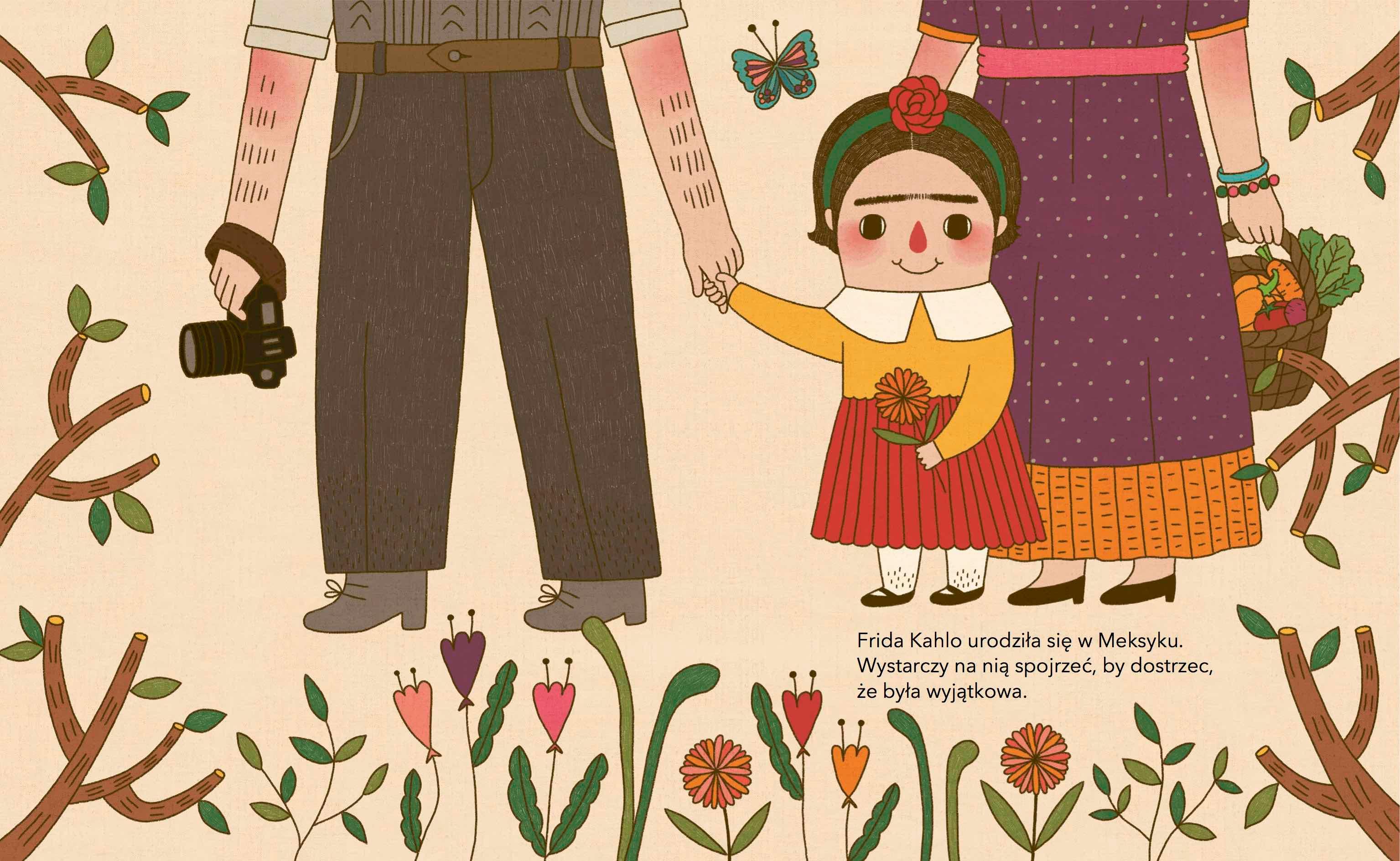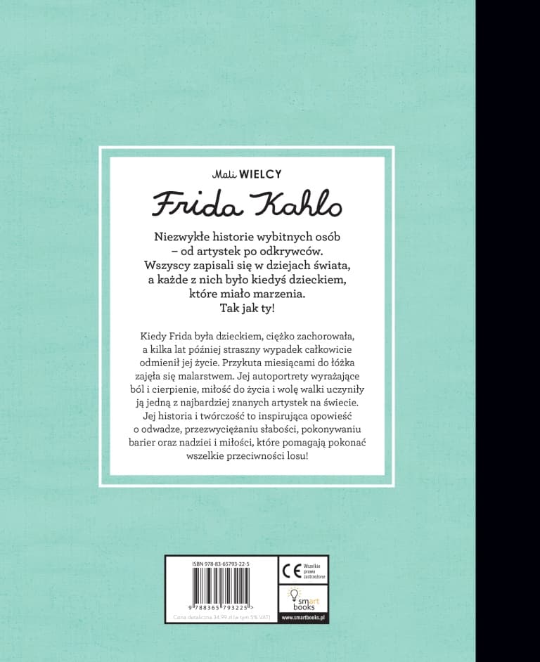 Poznaj historię Fridy Kahlo! Kiedy Frida była dzieckiem, ciężko zachorowała, a kilka lat później straszny wypadek całkowicie odmienił jej życie. Przykuta miesiącami do łóżka zajęła się malarstwem. Jej autoportrety wyrażające ból i cierpienie, miłość do życia i wolę walki uczyniły ją jedną z najbardziej znanych artystek na świecie. Jej historia i twórczość to inspirująca opowieść o odwadze, przezwyciężaniu słabości, pokonywaniu barier oraz nadziei i miłości, które pozwalają przetrwać wszystko! Mali WIELCY - bestsellerowa seria uznana przez krytyków i uwielbiana przez czytelników na całym świecie! Galeria inspirujących postaci i setki książek, książeczek i gier sprzedawanych w milionach egzemplarzy - teraz w języku polskim! Poznaj niezwykłe historie wybitnych osób - od malarek, muzyków, projektantek po naukowców, polityków, sportowców i odkrywczynie! Wszyscy zapisali się w dziejach świata, a każde z nich było kiedyś dzieckiem, które miało marzenia. Wyjątkowa seria, która zainspiruje dziecko w każdym wieku - od najmłodszego do wczesnoszkolnego. Niezwykłe historie pisane przystępnym językiem pozwolą dziecku utożsamić się z wielkimi postaciami i czerpać z nich wzorce, jak pasja, wytrwałość i odwaga w dążeniu do celu, niezbędne, by osiągnąć w przyszłości spełnienie i życiowy sukces! Na końcu każdej książki znajduje się biografia wraz z datami, faktami, ciekawostkami i autentycznymi zdjęciami bohatera opowieści zapewniająca wartościowy element edukacyjny. Prosty, wciągający przekaz, piękna kolorowa grafika i duża czcionka czynią z serii Mali WIELCY idealną lekturę zarówno do wspólnego czytania z dzieckiem, jak i do nauki samodzielnego czytania. Twarda i szyta oprawa zapewniają doskonałą trwałość. Stwórzmy nowe pokolenie wielkich ludzi, którzy zmienią świat: TERAZ MALI - WKRÓTCE WIELCY!