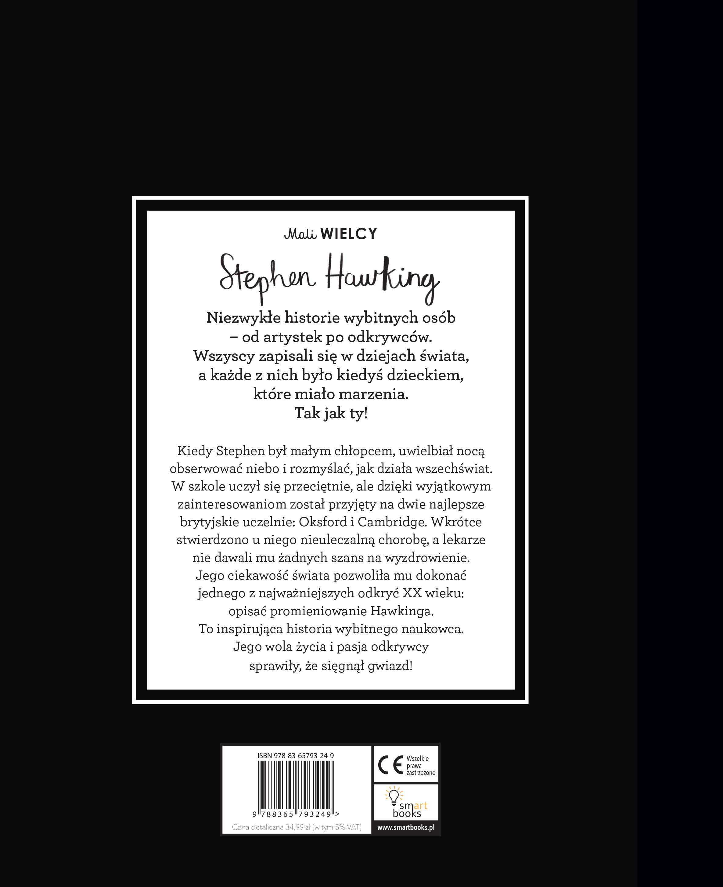 Poznaj historię Stephena Hawkinga! Kiedy Stephen był małym chłopcem, uwielbiał nocą obserwować niebo i rozmyślać, jak działa wszechświat. W szkole uczył się przeciętnie, ale dzięki wyjątkowym zainteresowaniom został przyjęty na dwie najlepsze brytyjskie uczelnie: Oksford i Cambridge. Wkrótce stwierdzono u niego nieuleczalną chorobę, a lekarze nie dawali mu żadnych szans na wygraną. Jego ciekawość świata pozwoliła mu dokonać jednego z najważniejszych odkryć XX wieku: opisać promieniowanie Hawkinga. To inspirująca historia wybitnego naukowca. Jego wola życia i pasja odkrywcy sprawiły, że sięgnął gwiazd! Mali WIELCY - bestsellerowa seria uznana przez krytyków i uwielbiana przez czytelników na całym świecie! Galeria inspirujących postaci i setki książek, książeczek i gier sprzedawanych w milionach egzemplarzy - teraz w języku polskim! Poznaj niezwykłe historie wybitnych osób - od malarek, muzyków, projektantek po naukowców, polityków, sportowców i odkrywczynie! Wszyscy zapisali się w dziejach świata, a każde z nich było kiedyś dzieckiem, które miało marzenia. Wyjątkowa seria, która zainspiruje dziecko w każdym wieku - od najmłodszego do wczesnoszkolnego. Niezwykłe historie pisane przystępnym językiem pozwolą dziecku utożsamić się z wielkimi postaciami i czerpać z nich wzorce, jak pasja, wytrwałość i odwaga w dążeniu do celu, niezbędne, by osiągnąć w przyszłości spełnienie i życiowy sukces! Na końcu każdej książki znajduje się biografia wraz z datami, faktami, ciekawostkami i autentycznymi zdjęciami bohatera opowieści zapewniająca wartościowy element edukacyjny. Prosty, wciągający przekaz, piękna kolorowa grafika i duża czcionka czynią z serii Mali WIELCY idealną lekturę zarówno do wspólnego czytania z dzieckiem, jak i do nauki samodzielnego czytania. Twarda i szyta oprawa zapewniają doskonałą trwałość. Stwórzmy nowe pokolenie wielkich ludzi, którzy zmienią świat: TERAZ MALI - WKRÓTCE WIELCY!