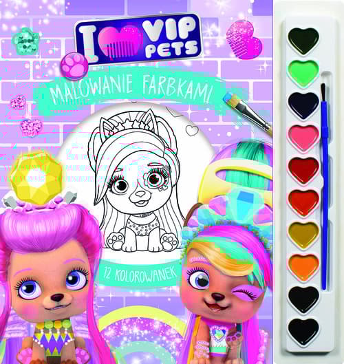 Kolorowanka z zestawem farb i pędzelkiem do malowania! I LOVE VIP PETS to pieski, które kochają wyjątkowe kreacje oraz modne uczesania i każdego dnia odwiedzają salon fryzjerski Fabii i Fabia. Zanurz pędzelek w wodzie, nabierz farby i maluj ich portrety, ciesząc się wspaniałą zabawą. Książka zawiera 12 czarno-białych ilustracji do pokolorowania, zestaw 10 farb w różnych kolorach oraz 1 pędzelek. Dzięki perforowanym kartkom możesz łatwo oderwać poszczególne obrazki, aby je oprawić lub powiesić gdziekolwiek chcesz. Malowanie farbami doskonali zdolności manualne oraz wspiera integrację sensoryczną dziecka.