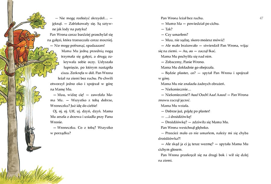 Dziesięć opowiadań o nietuzinkowej parze przyjaciół – Mamie Mu i Panu Wronie – czyli dużo czytania i jeszcze więcej śmiechu! Powolutku, gałąź po gałęzi, Mama Mu wchodziła coraz wyżej. W końcu wspięła się prawie na sam czubek. Obok drzewa przelatywał właśnie Pan Wrona. – Tutaj, Panie Wrono! – zawołała Mama Mu. – Tu jestem! Pan Wrona zawrócił momentalnie, przysiadł na drzewie i zaczął wpatrywać się w Mamę Mu osłupiały. – Jak to? Jak tu wlazłaś? Jak to zrobiłaś? – Wdrapałam się – odparła Mama Mu. – Ale dobrze, że przyleciałeś, bo Linus nie powiedział mi wszystkiego. – Czego na przykład? – Jak się schodzi. Muu! Polecamy również książki obrazkowe: „Mama Mu na huśtawce", „Mama Mu na sankach", „Mama Mu sprząta", „Mama Mu buduje", „Mama Mu nabija sobie guza" i „Mama Mu czyta", zbiór opowiadań „Mama Mu na rowerze i inne historie", a także „Kolorowankę Mamy Mu i Pana Wrony". Smakowite dialogi, szybkie zwroty akcji, niebanalny humor i świetna konstrukcja postaci – tak pisze Jujja Wieslander. Bogate w szczegóły, genialne ilustracje Svena Nordqvista, znanego również z książek o Pettsonie i Findusie, pełne są niespodzianek dla spostrzegawczych i wspaniale oddają charaktery obu bohaterów – Mamy Mu, dla której nie ma rzeczy niemożliwych, i Pana Wrony, który zawsze musi trochę ponarzekać i pokrakać.