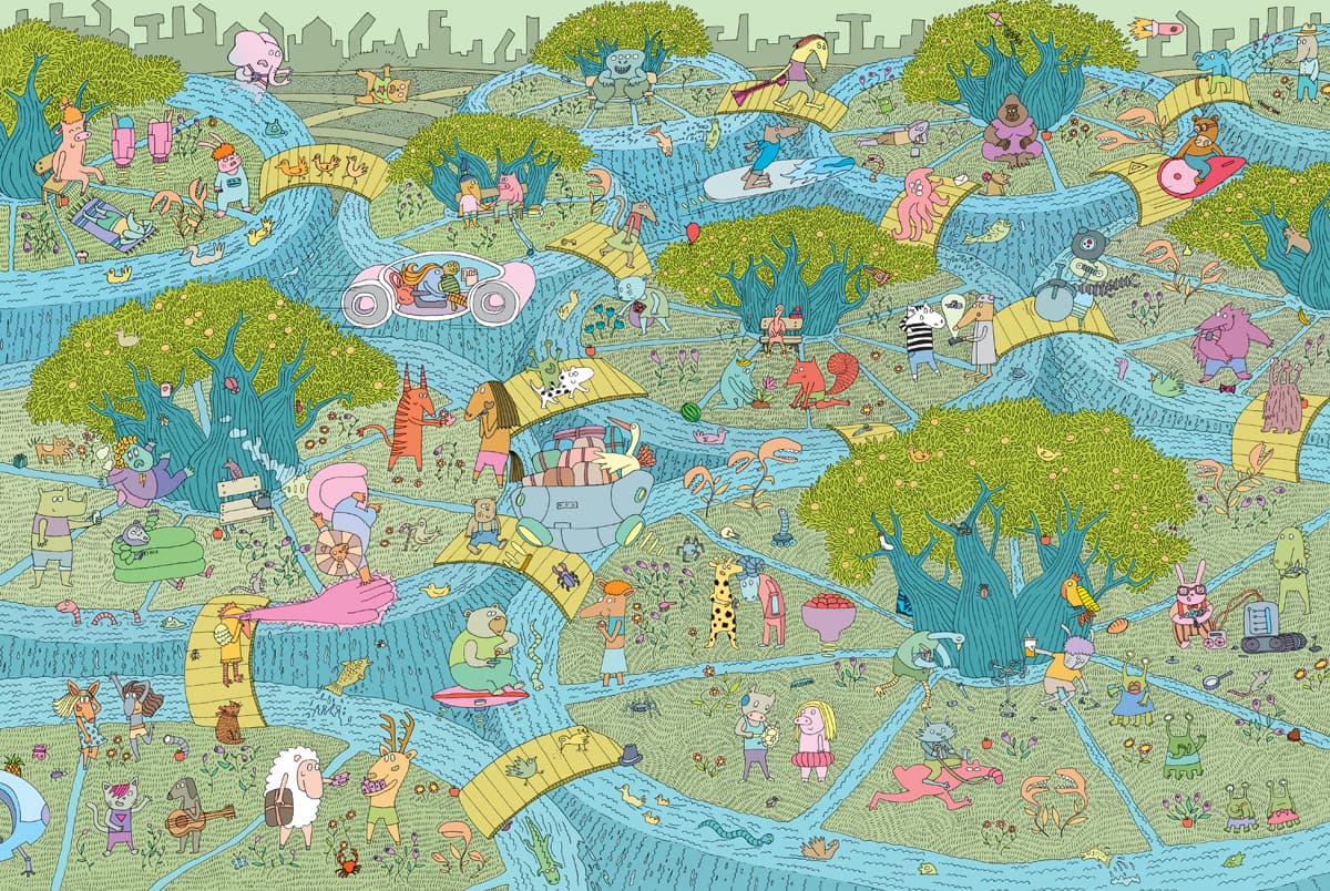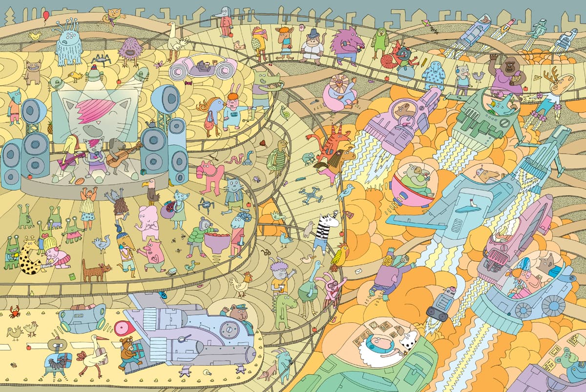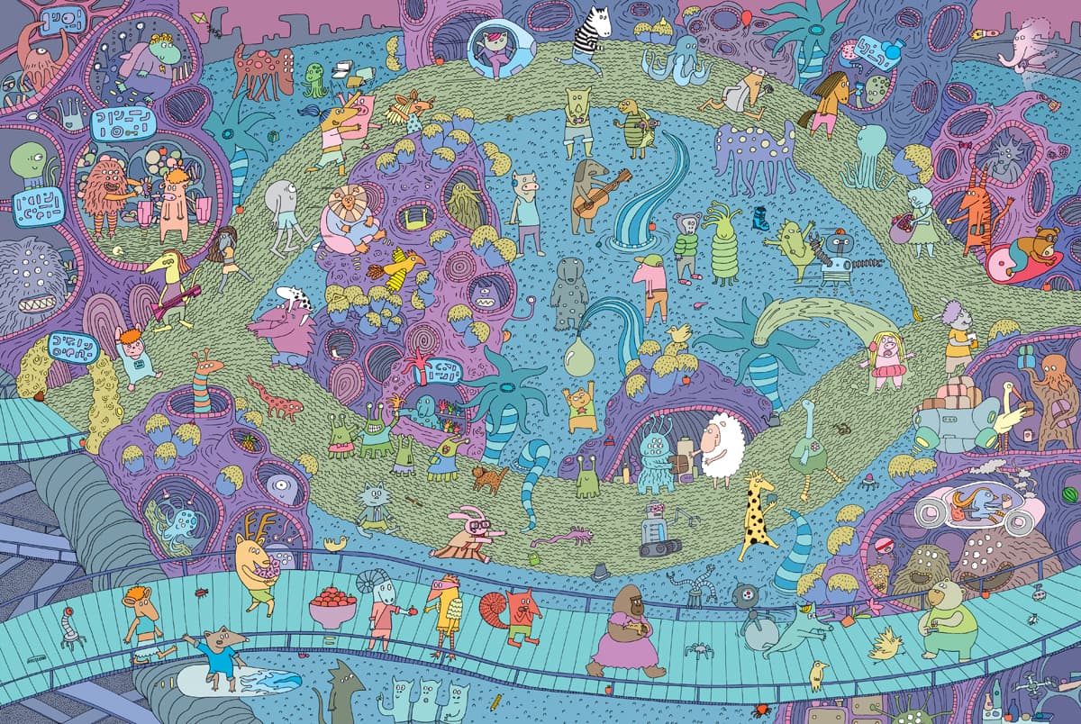 Każda rozkładówka książki jest kosmicznie narysowaną panoramą fragmentu tytułowego miasteczka. Razem tworzą obraz jednego dnia z życia Mamoko i jego sympatycznych mieszkańców. Uważne dziecięce oko odnajdzie tu kilkadziesiąt równolegle poprowadzonych historii, opowiedzianych wyłącznie za pomocą rysunków. Pełne najrozmaitszych szczegółów ilustracje można oglądać godzinami, śledząc przygody poszczególnych bohaterów, oglądając zakamarki miasteczka i wyszukując ukryte przedmioty.
