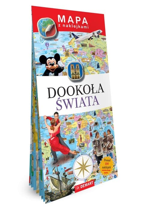 Składana mapa świata w formacie B1 z dołączonymi naklejkami, do samodzielnego uzupełnienia treści mapy. Mapa zawiera opisy państw, stolic, większych wysp i wód. Dziecko przez zabawę poznaje geografię świata, położenie i wielkość różnych państw. Naklejki z charakterystycznymi dla danego państwa obiektami turystycznymi i historycznymi czy atrakcjami rozbudzają ciekawość i chęć poznania różnych kultur. Na odwrocie mapy znajdują się krótkie opisy przedstawionych obiektów.