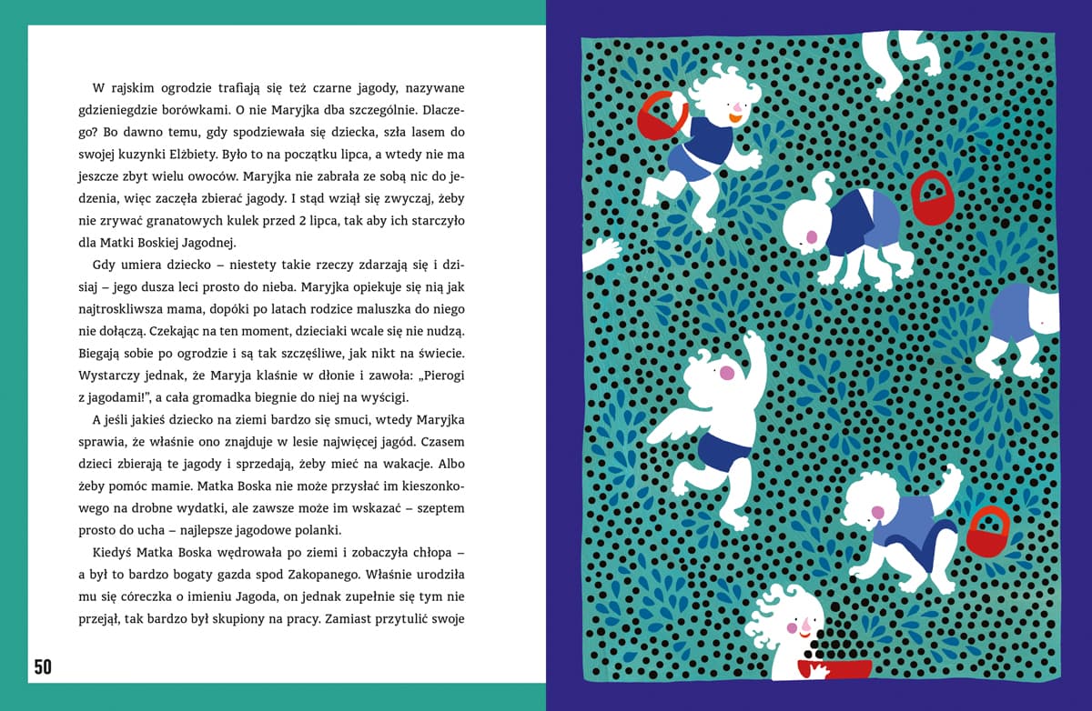 Oto podania ludowe o Matce Boskiej w autorskim opracowaniu Justyny Bednarek i z zachwycającymi ilustracjami Marianny Oklejak – wzruszające, pełne czułości i humoru, a także zaskakująco współczesne. Pojawią się tu takie tematy, jak odpowiedzialność człowieka za dokonywane wybory, gościnność wobec uchodźców, a także troska o zwierzęta i całą planetę. Czy Maryja była pierwszą ekolożką? Co pająk robi na ścianie w raju? Kto przyniósł z nieba pierogi z jagodami? Przekonajcie się sami. OD AUTORKI: Gdy byłam mała, opiekowała się mną niania mojej mamy, Cecylia Kot, wiejska kobieta z Podkarpacia. Uosobienie miłości. I to ona przekazała mi niektóre z tych legend. Śpiewała mi je, opowiadała wierszem. Te proste bajki z jednej strony tłumaczyły, skąd się wzięło to czy tamto, kolor piórek kanarka, drżenie liści osiki, a z drugiej – włączały przyrodę do sfery sacrum, czyniły z niej element historii zbawienia. Od razu jednak spieszę z wyjaśnieniem, że moja książka nie jest pracą etnograficzną. Nie byłam bardzo wierna pierwowzorom, nie podchodziłam nabożnie do fabuły. Czasem to czy owo „domyśliłam”, nie naruszając jednak głównych wątków. Zależało mi na tym, żeby tchnąć w te stare historie ducha współczesności i wzbogacić je nowymi treściami. Justyna Bednarek jest romanistką, dziennikarką i autorką książek dla dzieci. Jej „Niesamowite przygody dziesięciu skarpetek”, zilustrowane przez Daniela de Latoura, otrzymały wiele ważnych nagród oraz nominacji (w tym Warszawską Nagrodę Literacką oraz nagrodę Przecinek i Kropka), a także znalazły się na liście lektur szkolnych. Pisarka mieszka na warszawskich Bielanach, a dom dzieli z dziećmi, psami i papugą. Marianna Oklejak ukończyła Wydział Grafiki Akademii Sztuk Pięknych w Warszawie (2006) w pracowniach projektowania książki i ilustracji. Rysuje, projektuje książki i plakaty. Jej ilustracje zdobyły wiele ogólnopolskich nagród i wyróżnień, w tym te przyznawane przez Polską Sekcję IBBY („Cuda wianki. Polski folklor dla młodszych i starszych”, „Cuda-niewidy: zagadki dla młodszych i starszych”, „Jestem miasto. Warszawa”, „Król Maciuś Pierwszy”, „Król Maciuś na wyspie bezludnej”), a także trafiały do finałów prestiżowych konkursów zagranicznych (m.in. CJ Picture Book Award, International Nami Concours, Golden Pinwheel Young Illustrators Competition). Artystka mieszka i pracuje w Warszawie.