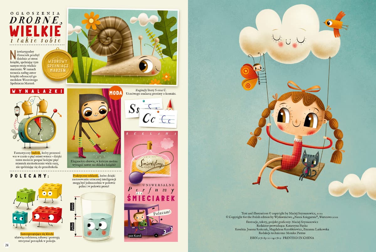 Niezwykły zbiór informacji na temat marzeń! Niniejsza książka pomoże znaleźć odpowiedzi na wiele nurtujących pytań związanych z marzeniami, takich jak chociażby: Jakie są rodzaje marzeń? Czy szklanki marzą, a jeśli tak, to o czym? Skąd się biorą marzenia? Jak kartonowe pudła pomagają w marzeniu? O czym marzą domy, wieloryby i pomniki? Do czego mogą się przydać palec wskazujący i mapa? Które pozycje ciała sprzyjają marzeniom? Jakie są wymarzone rośliny i zwierzęta? O czym marzą cyfry i litery? Na szczegółowych ilustracjach obejrzycie marzenia wielkie i niewielkie, praktyczne i bezsensowne, marzenia kuchenne, a także samozbierające się grzyby, dżdżownicę w tubce czy samochód z dwiema kierownicami. Jedno jest pewne: ta książka marzy, byście ją przeczytali! Maciej Szymanowicz w dzieciństwie kochał rysować, ale studiować postanowił na białostockim wydziale lalkarskim Akademii Teatralnej. Został aktorem lalkowym, ale to zajęcie nie przypadło mu do gustu. Powrócił do miłości z dzieciństwa. Ilustruje, projektuje książki, tworzy plakaty teatralne i gry planszowe. W 2014 wydał autorską książkę „Najmniejszy słoń świata”. Za ilustracje do książki „Asiunia” otrzymał Nagrodę Miasta Stołecznego Warszawy (2011), a za „Wszystkie moje mamy” nagrodę w konkursie Przecinek i Kropka oraz nagrodę Festiwalu Literatury dla Dzieci (2014). Powyższy opis pochodzi od wydawcy.Szczegółowe informacje na temat książki Marzenia. Fakty, mity, głupoty