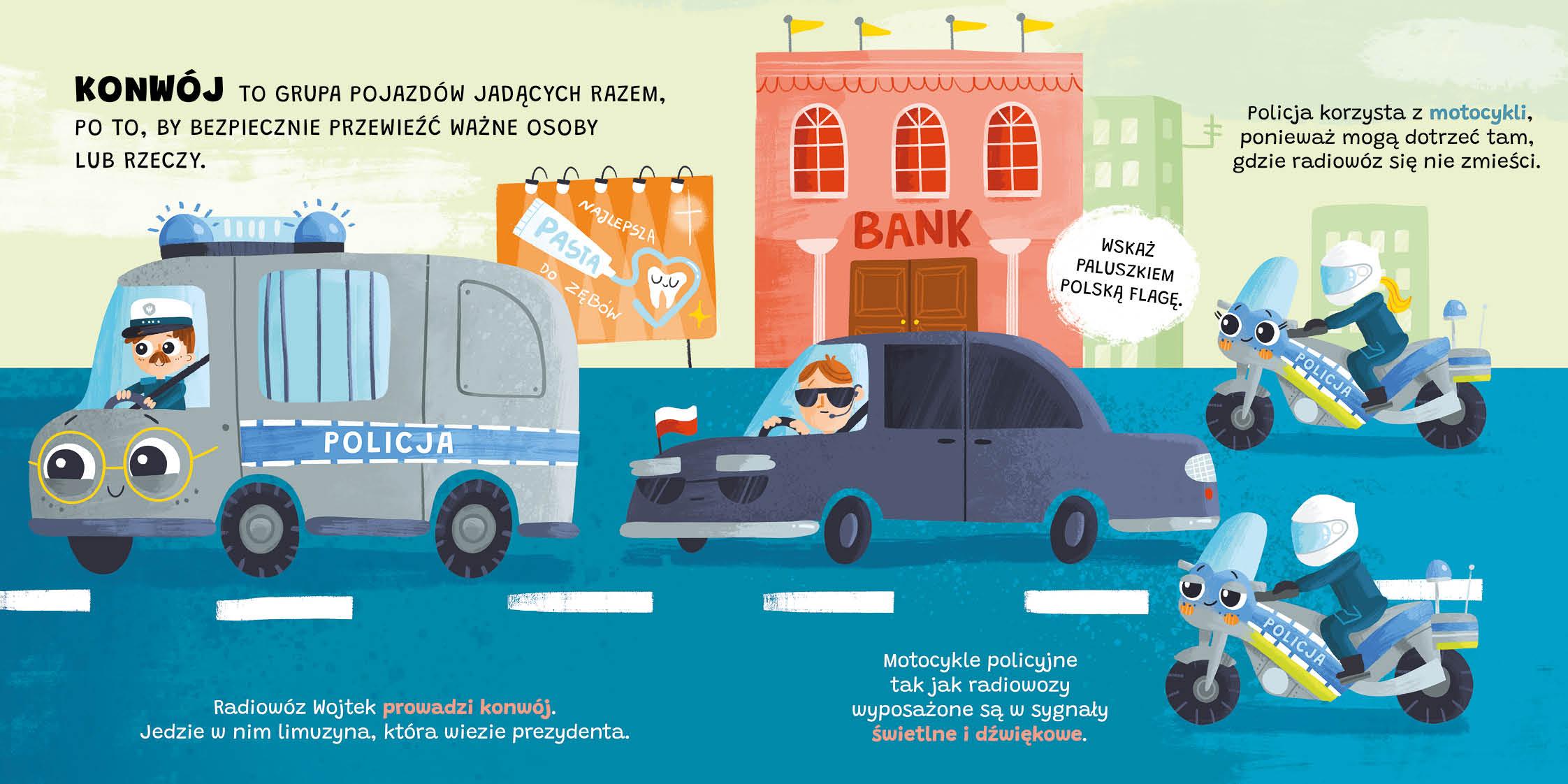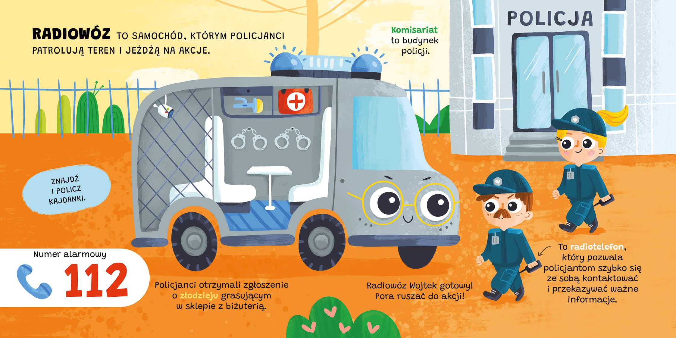 Gdzie można spotkać radiowóz? Do czego służy? Dlaczego jest bardzo ważnym pojazdem? W tej książeczce znajdziesz odpowiedzi na wszystkie pytania. „Maszyny i pojazdy” to seria prostych boardbooków, dzięki którym dziecko pozna różne pojazdy, które na co dzień można zobaczyć na placu budowy i w mieście oraz te, które pracują w kosmosie. Krótkie historyjki przedstawiają zadania za jakie odpowiadają poszczególne maszyny. Ale to nie wszystko! W tekst wplecione zostały propozycje zabaw aktywizujących. Kolorowe i wesołe ilustracje wspaniale pokazują różne maszyny i pojazdy, a kartonowe strony i zaokrąglone rogi gwarantują małym rączkom bezpieczeństwo podczas oglądania książeczek.