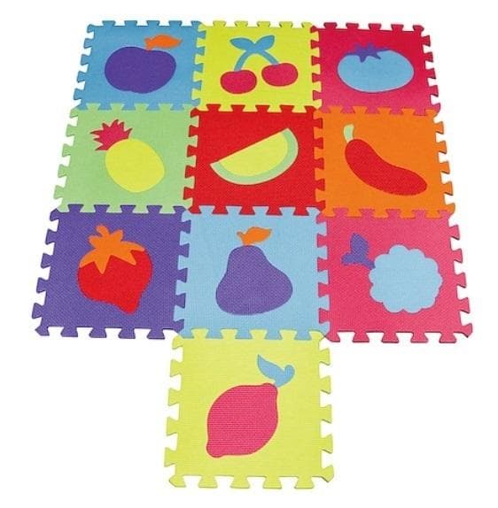 Układanka z owocami może być używana jako mata oraz jako puzzle do układania. Jest zrobiona z miękkiej pianki, miłej w dotyku. Może też posłużyć jako podkładka przy innych zabawach czy drzemce. Zabawka uczy: spostrzegawczości, rozpoznawania kolorów i kształtów, budowania figur przestrzennych, zabawy z wyobraźnią.