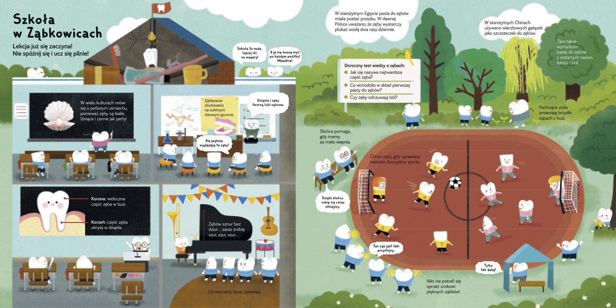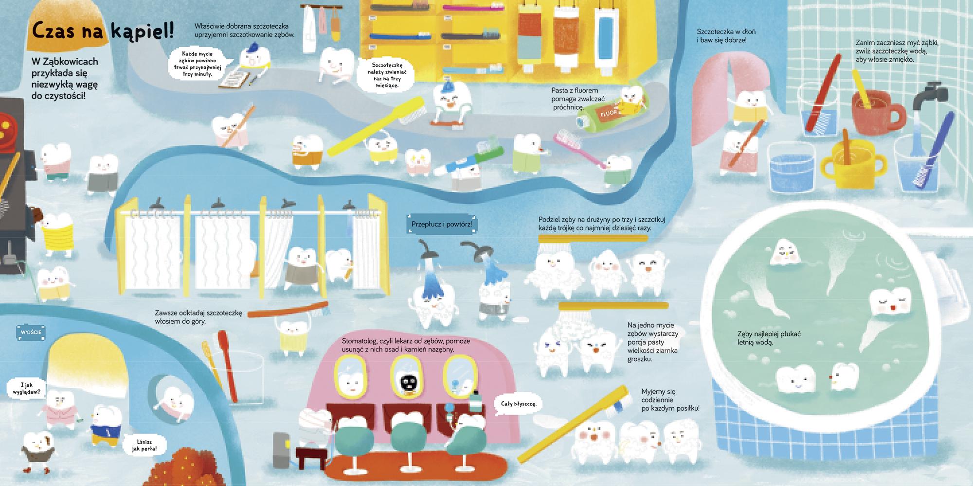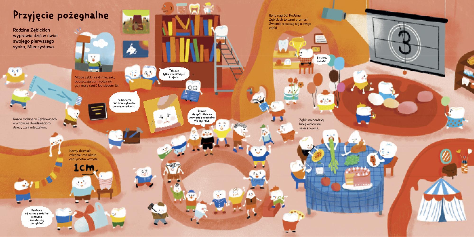 Zapraszamy do buzi - miasteczka pełnego ząbków. Odwiedzimy rodzinę Ząbkowickich i zobaczymy, jak żegnają pierwszego mleczaka. Zajrzymy do szkoły w Ząbkowicach, gdzie ząbki przygotowują się do swoich ról. Będziemy też w fabryce, gdzie rozdrabniają jedzenie; potowarzyszymy ząbkom podczas kąpieli i wizyty u dentysty; zobaczymy jak walczą z zarazkami i jak możemy im pomóc, by służyły nam jak najdłużej. „Między nami ząbkami” to napisana przez ekspertów duża kartonowa książka z okienkami i scenką pop up, która w zabawny sposób oswaja z tematem higieny jamy ustnej. Opatrzona niezwykle szczegółowymi ilustracjami, które przedstawiają scenki i zdarzenia z życia ząbków. To pobudza wyobraźnię, pomaga dzieciom zrozumieć, jak funkcjonują zęby; uświadamia, dlaczego trzeba o nie dbać i podpowiada, jak robić to prawidłowo. Bez nudnego pouczania! • Treść dostosowana do wieku najmłodszych • Piękne ilustracje najwyższej jakości, przywodzące na myśl serię Było sobie życie Trwała i bezpieczna kartonowa oprawa • Otwierane okienka – nauka i zabawa w jednymSzczegółowe informacje na temat książki Między nami ząbkami