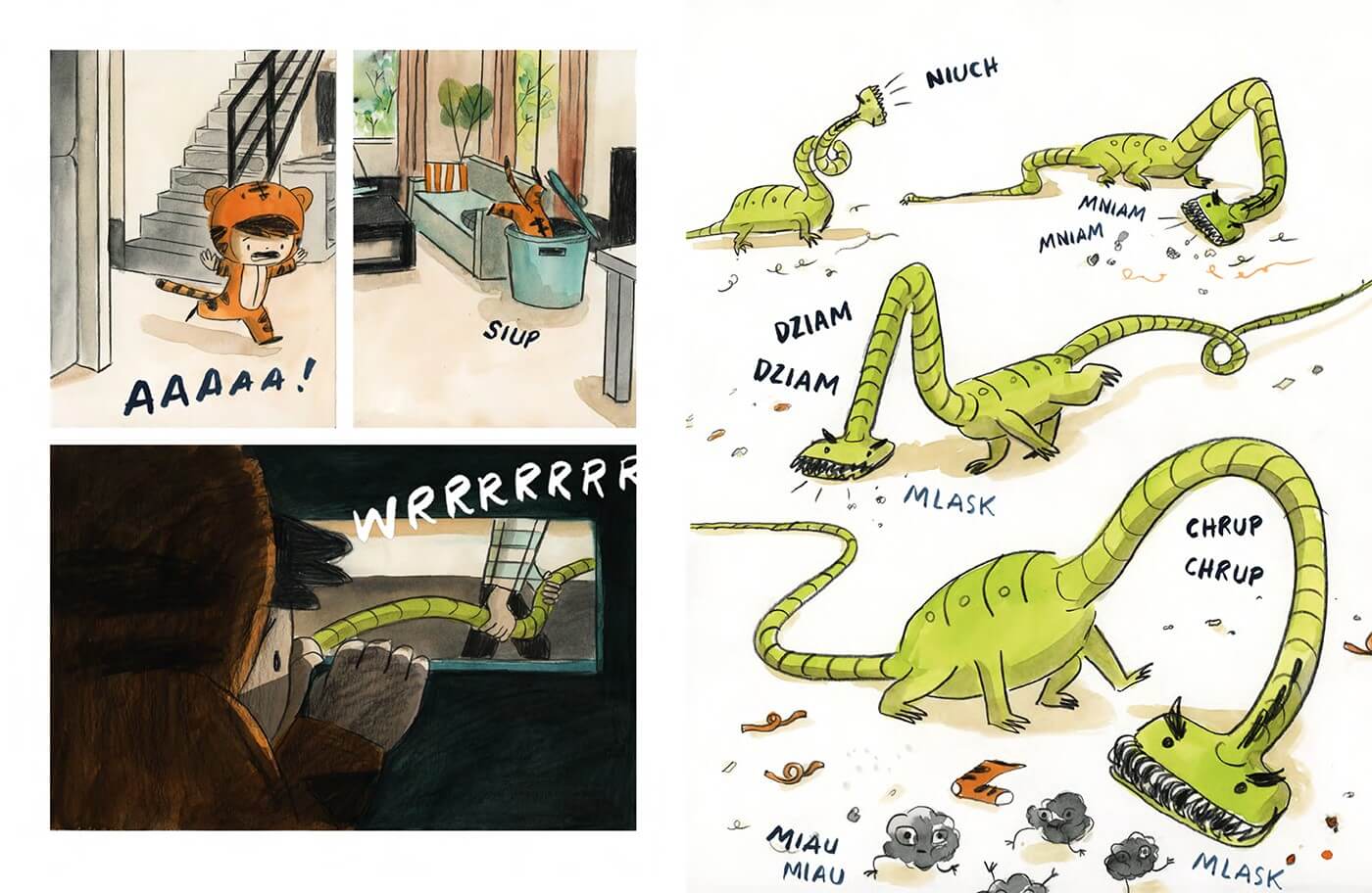 Świat za progiem własnego pokoju jest pełen niespodzianek i dziwnych, arcygroźnych domostworów. Czasem huczą i wsysają wszystko wokół, niekiedy zieją chłodem albo przeżuwają i ciumkają godzinami to, co wpadnie im do paszczy. Warczą, buczą i hurgocą po całym mieszkaniu. „Mika i wyjec” to pierwszy komiks z serii ARCYGROŹNE DOMOSTWORY, przeznaczonej dla najmłodszych czytelników. O spotkaniu z czymś, co – nie do końca jeszcze poznane i oswojone – bywa dla małego dziecka źródłem niepokoju. Jak długo można leżeć i nudzić się w łóżku? Cóż, niezbyt długo. Mika żegna się więc z przyjaciółmi i rusza w drogę. Kiedy spotyka wyjca, robi się niebezpiecznie. Na szczęście Mika może liczyć na przyjaciół. Z nimi wszystko jest już proste, nawet pokonanie najstraszniejszego domostwora. W przygotowaniu kolejny tom serii: „Mika i bulgot”.