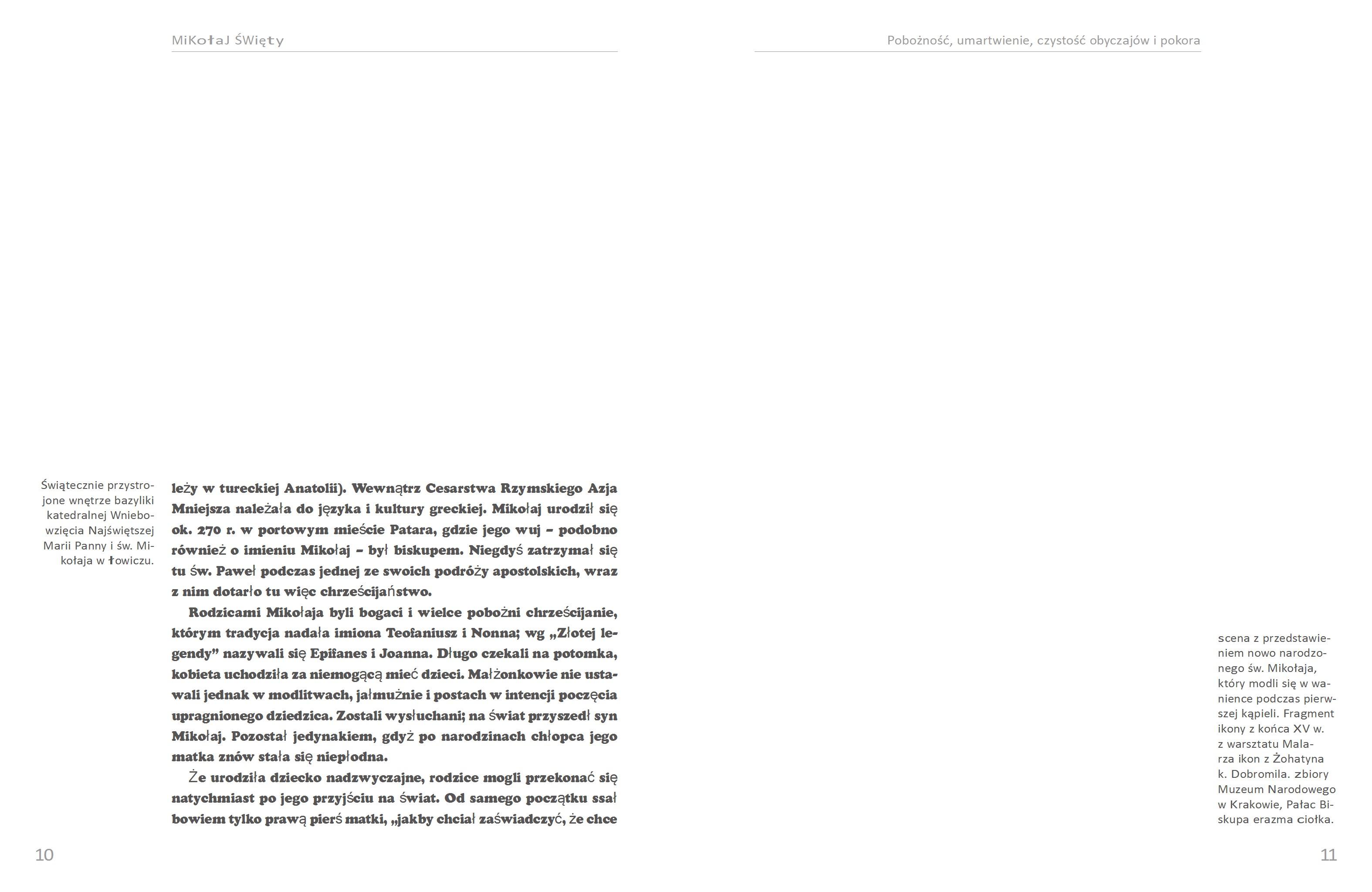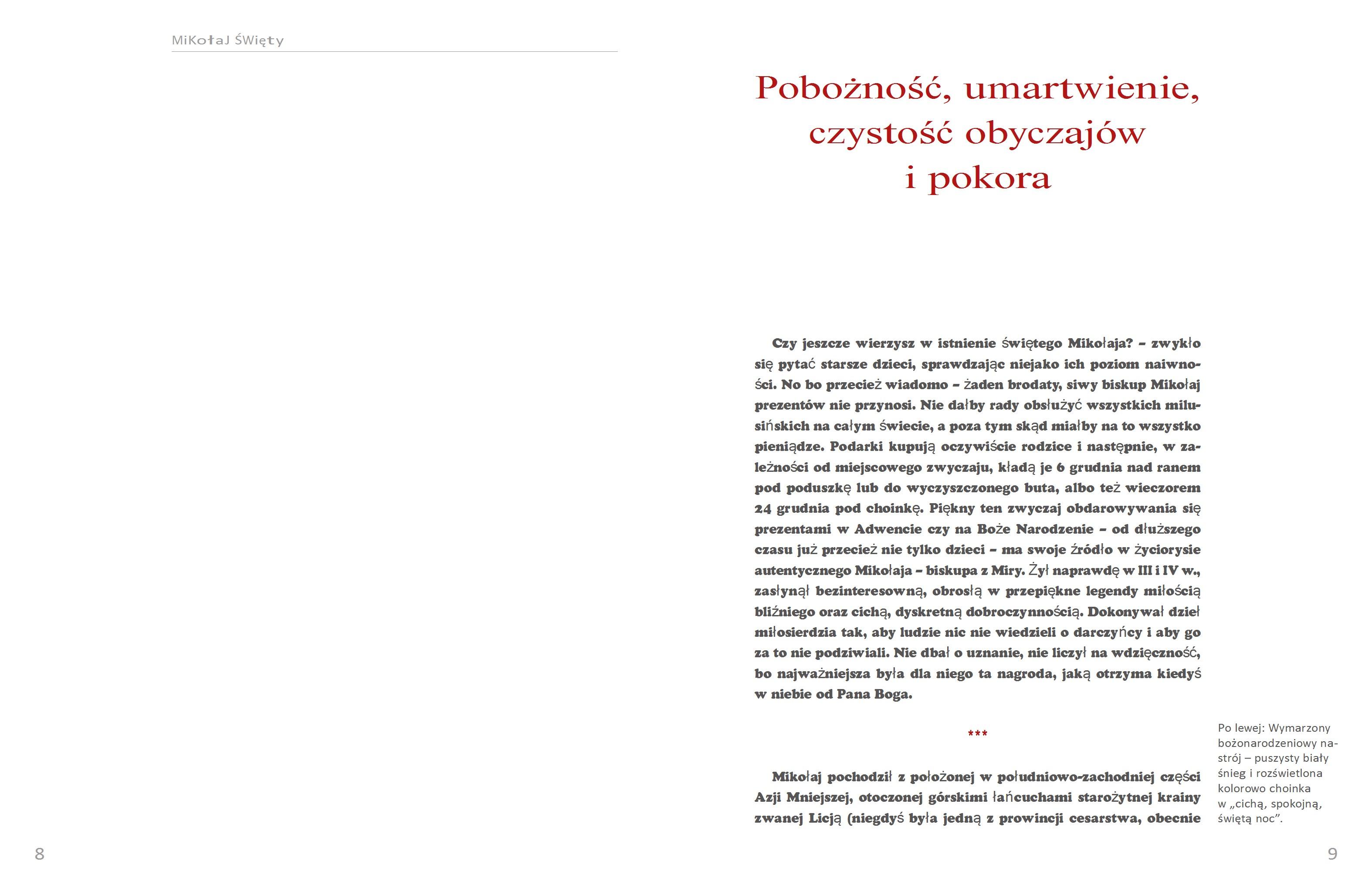 Czy wierzysz w św. Mikołaja? Jeżeli myślisz przy tym o czerwono ubranym dużym krasnalu albo o starszym panu z białą brodą i z brzuszkiem oraz w czerwonej czapie, to znak, że zdecydowanie należy sięgnąć po tę publikację. Bo choć świąteczny zwyczaj dawania prezentów został już dziś przykryty grubą warstwą komercji, to jednak źródła tej pięknej tradycji sięgają III i IV wieku po Chrystusie, kiedy biskup Mikołaj z Miry dał jedno z najznamienitszych świadectw chrześcijańskiej miłości bliźniego oraz obrony wiary. Już on sam był wymodlonym prezentem dla swoich rodziców, którzy długo nie mogli doczekać się potomka. Okazał się dobrym, zdolnym i pobożnym synem. Został najpierw kapłanem, a później biskupem. Będąc niezłomnym stróżem wiary, wielokrotnie padał ofiarą prześladowań, ale nigdy nie zdradził Chrystusa. Pragnął Zbawiciela naśladować we wszystkim. Szczególnie wziął sobie do serca przypowieść o bogatym młodzieńcu, gdyż sam pochodził z zamożnej rodziny. Po śmierci rodziców rozdał więc odziedziczony spadek potrzebującym. Z tego przez wieki wyrosła piękna tradycja obdarowywania się prezentami. Kiedy Biskup z Miry zmarł 6 grudnia w połowie IV wieku, natychmiast rozwinął się kult jego osoby, gdyż odszedł do Pana w powszechnej opinii świętości. Dziś św. Mikołaj nadal jest jednym z najbardziej znanych świętych całego świata chrześcijańskiego, choć wielu zapomniało, kim naprawdę była ta wielka postać. Przypominają to w tej książce w barwny sposób Jolanta Sosnowska słowem, a mistrz fotografii Adam Bujak obrazem. Autorka odtwarza w literackiej opowieści historyczną postać św. Mikołaja z Miry, oświetlając jego niezwykłe życie, które do dziś pozostaje niedościgłym wzorem cnót. Adam Bujak, dokumentując fenomenalne dzieła sztuki przedstawiające świętego Biskupa, udowadnia natomiast, jak szeroko kult Mikołaja jest w Polsce, i nie tylko, obecny. Pokolenia artystów oddawały hołd temu człowiekowi, który w swej radykalnej miłości do Jezusa potrzeby innych zawsze stawiał ponad swoje. Paradoksalnym zatem jest, że blisko 1600 lat po śmierci św. Mikołaja symbolem niepohamowanej konsumpcji stała się jego karykatura. Tym bardziej trzeba więc sięgnąć po tę publikację, usiąść w spokojnym miejscu i zanurzyć się w żywocie niezwykłego świętego. I po tym, miejmy nadzieję, drogi Czytelniku, zapewne uwierzysz w Mikołaja – świętego, prawdziwego. Ta piękna, barwna, żywo napisana książka przeznaczona jest także dla młodszego odbiorcy.