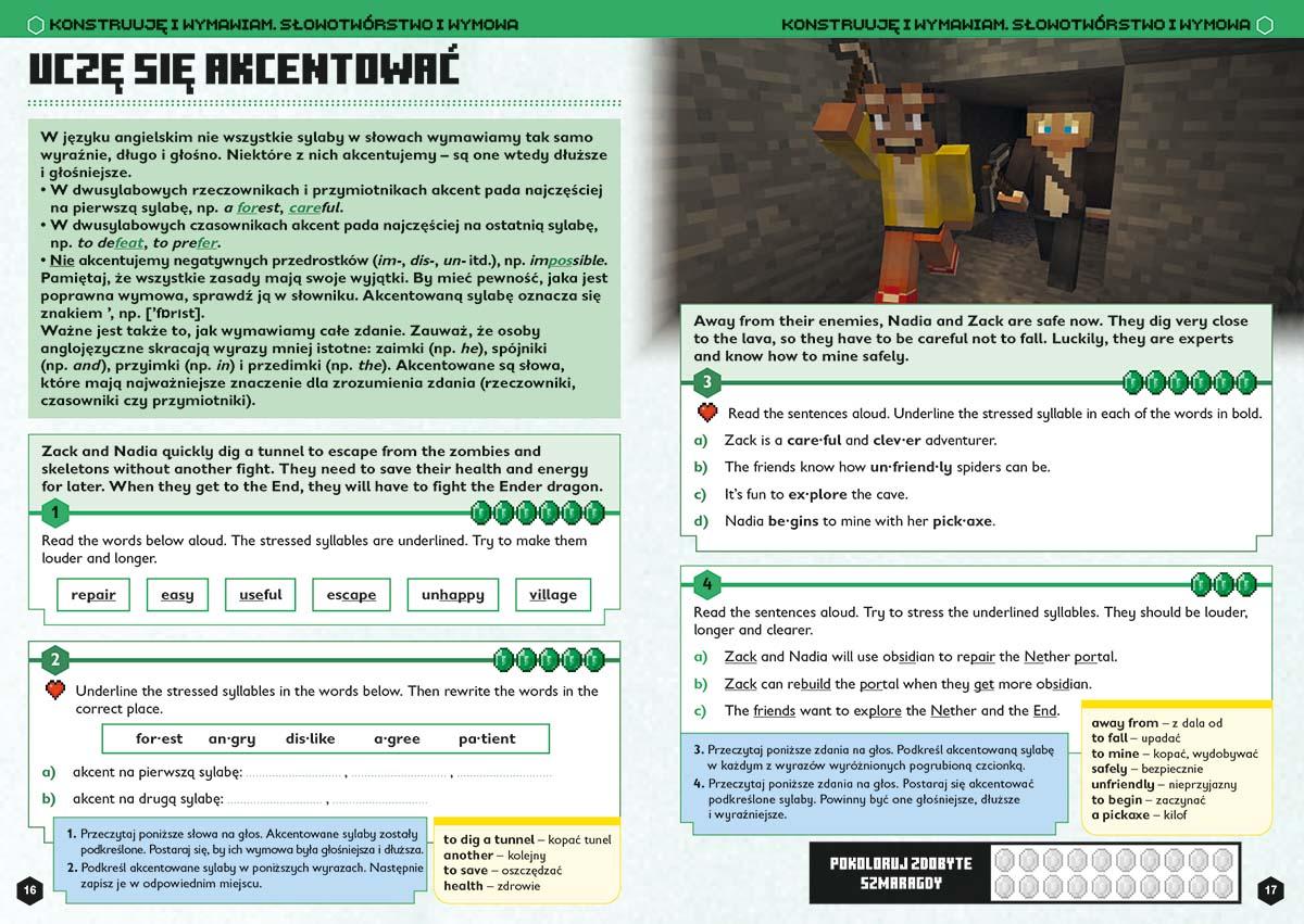 „Minecraft. Język angielski. Megazadania. 12+" to niezwykły zeszyt zadań do nauki języka angielskiego oraz zaproszenie do emocjonującej przygody w świecie Minecrafta. Książka rekomendowana jest dla dzieci w wieku powyżej 12 lat i odpowiada poziomowi Intermediate Plus. Eksplorowanie kolejnych biomów, podejmowanie wyzwań i rozwiązywanie zagadek osadzonych w minecraftowym uniwersum to doskonała zabawa na 80 stronach i najlepsza forma nauki języka angielskiego, jaką można sobie wyobrazić! Wypełniając kolejne misje, dziecko ćwiczy umiejętności językowe. Książka ta jest doskonałym uzupełnieniem i rozszerzeniem materiału szkolnego, dzięki czemu rozbudza ciekawość językową dzieci i wzmacnia ich kompetencje oraz pewność siebie na gruncie języka angielskiego. W książce znajdują się zadania z zakresu różnych działów lingwistyki, takich jak: pisownia i wymowa, słownictwo, gramatyka, interpunkcja, a także komponowanie wypowiedzi. Wszystkie zagadnienia mają teoretyczne wprowadzenie w języku polskim oraz atrakcyjne zadania opracowane w języku angielskim oparte na aktywnościach takich jak: rozwiązywanie krzyżówek, uzupełnianie luk w zdaniach, ćwiczenie pisania po śladzie, szukanie ukrytych słów w wykreślankach i wężach wyrazowych, tworzenie własnych wypowiedzi, opisywanie ilustracji. Słowniczki z listą wprowadzonych w danym rozdziale trudniejszych słów oraz polskie tłumaczenia poleceń zamieszczone u dołu strony sprawiają, że całość jest przystępna i niezwykle skuteczna. Za każde rozwiązane zadanie dziecko zdobywa szmaragdy, które na końcu książki może „wymienić” na nagrody. O odpowiedni poziom zaangażowania dba też wciągająca opowieść o przygodach Zacka i Nadii, towarzyszących czytelnikowi przez całą książkę. „Minecraft. Język angielski. Megazadania. 12+” to oficjalne wydanie na licencji Mojanga, a edycja polska powstała we współpracy z doświadczonym nauczycielem języka angielskiego i metodykiem nauczania wczesnoszkolnego. W serii ukazało się sześć tomów: Minecraft. Język angielski. Megazadania. 7+ Książka rekomendowana jest dla dzieci w wieku powyżej 7 lat i odpowiada poziomowi Elementary. Minecraft. Język angielski. Megazadania. 8+ Książka rekomendowana jest dla dzieci w wieku powyżej 8 lat i odpowiada poziomowi Elementary/Pre-intermediate. Minecraft. Język angielski. Megazadania. 9+ Książka rekomendowana jest dla dzieci w wieku powyżej 9 lat i odpowiada poziomowi Pre-intermediate. Minecraft. Język angielski. Megazadania. 10+ Książka rekomendowana jest dla dzieci w wieku powyżej 10 lat i odpowiada poziomowi Pre-intermediate/Intermediate. Minecraft. Język angielski. Megazadania. 11+ Książka rekomendowana jest dla dzieci w wieku powyżej 11 lat i odpowiada poziomowi Intermediate. Minecraft. Język angielski. Megazadania. 12+ Książka rekomendowana jest dla dzieci w wieku powyżej 12 lat i odpowiada poziomowi Intermediate Plus. Polecamy także serię książek do nauki matematyki z Minecraftem: Minecraft. Matematyka. Megazania. 7+ Minecraft. Matematyka. Megazania. 8+ Minecraft. Matematyka. Megazania. 9+ Minecraft. Matematyka. Megazania. 10+ Minecraft. Matematyka. Megazania. 11+ Minecraft. Matematyka. Megazania. 12+ Zarówno seria matematyczna, jak i językowa to idealne połączenie ulubionej gry Minecraft i przyjaznej edukacji. Książki sprawdzą się jako mądry prezent na urodziny, imieniny, święta czy zakończenie roku szkolnego.