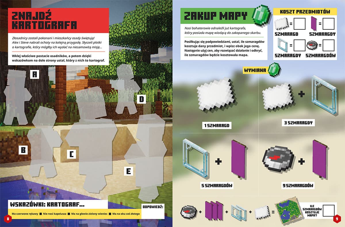 Kolejna niezwykła propozycja dla fanów Minecrafta stworzona we współpracy ze studiem Mojang! Dołącz do Alex i Steve’a, którzy wyruszają na poszukiwanie skarbu. Pomóż im przygotować ekwipunek i odnaleźć kartografa, który posiada mapę wiodącą do zakopanego skarbu. Aby dotrzeć do skrzyń ukrytych na dnie oceanu, wykaż się wiedzą o Świecie Podstawowym i rozwiąż niezwykle wciągające zadania i łamigłówki! Pokonaj labirynt, złam kod, połącz w pary, policz szmaragdy i uzupełnij strony naklejkami – jest ich ponad 200!Szczegółowe informacje na temat książki Minecraft. Naklejkowa przygoda. Poszukiwacze skarbów