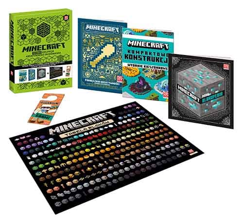 „Nowa kolekcja kreatywnego budowania" to świetny prezent zarówno dla wytrawnych fanów Minecrafta, jak i dla tych, którzy dopiero rozpoczynają swoją przygodę z jedną z najpopularniejszych gier wszech czasów. W eleganckim pudełku znajdują się nowe wydania trzech książek, których zawartość stanowi szczególny wybór treści z wcześniej wydanych pozycji w serii o Minecrafcie. Z „Podręcznika kreatywności” (liczącego 32 strony) dowiesz się, jak wznieść pierwsze budowle, a także poznasz porady dotyczące oświetlenia i stylów architektonicznych. „Kompaktowe konstrukcje” (32 strony) to zbiór wskazówek, jak opracować, zbudować i modyfikować 9 miniprojektów w grze. A w „Miniblokopedii” (24 strony) znajdziesz całe mnóstwo informacji o niesamowitych ozdobnych blokach! Uzupełnieniem kolekcji jest fantastyczny plakat z tabelą bloków i zawieszka na drzwi.