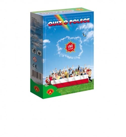 „Quiz o Polsce” - to gra dla całej rodziny. Jest doskonałą i emocjonującą zabawą sprawdzającą i wzbogacającą wiedzę na temat polskiej historii, geografii, kultury i przyrody. Podstawowe zadanie graczy - to wybranie właściwej odpowiedzi jednej z trzech) na wybrane losowo pytanie. Dodatkowym urozmaiceniem jest sprawdzenie znajomości polskiej ortografii, umiejętności wymowy trudnych polskich zdań itp. Zawartość: - karty pytań i odpowiedzi - 45 sztuk - żetony - 36 sztuk - pionki - 3 sztuki - klepsydra - kostka Wiek graczy: 10+ Liczba graczy: 2-3