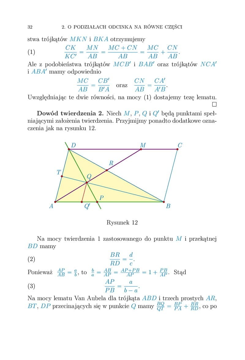 Druga miniatura również ma charakter geometryczny. Poświęcona jest konstrukcyjnym metodom podziału odcinka na równe części, przy czym przez termin „konstrukcyjny” rozumie się konstruowalność w sensie Platona, czyli za pomocą cyrkla i linijki. Jakkolwiek metody„platońskiego” podziału odcinka na równe części zostały opracowane już w starożytności, a dzięki twierdzeniom sformułowanym przez Talesa z Miletu (żył w latach 620-540 przed Chrystusem), stały się znane nawet uczniom szkół podstawowych, prezentowane w tym artykule sposoby podziału są nietypowe i mało znane. Istotną cechą tych metod jest ich charakter rekurencyjny: jeżeli umiemy podzielić odcinek na n części, to umiemy też podzielić go na n ` 1 części. Właściwość ta wprost zachęca do zastosowania komputera — charakter rekurencyjny ułatwia zaprogramowanie konstrukcji i wykonania jej z zastosowaniem technologii informacyjnych.