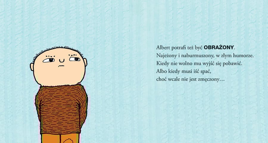 "Albert przegląda się w lustrze i patrzy na swoją fotografię. Zastanawia się nad tym, jak wygląda, kim jest. Ale przecież ma o wiele więcej twarzy niż widzi w lustrze czy na zdjęciu! To nieco inna książka o Albercie niż pozostałe – mniejszy format, ale za to prawie dwa razy więcej stron. Na każdej rozkładówce widać Alberta z innym wyrazem twarzy i postawą ciała. Czasem dowiadujemy się, na co Albert tak właśnie reaguje, a czasem musimy użyć swojej wyobraźni. To świetny punkt wyjścia do rozmowy z dziećmi o emocjach. Albert Albertson mieszka z bardzo miłym tatą i kotem Puzlem. Jak każdy kilkulatek czasem ma problemy z zasypianiem, potrafi rano strasznie się grzebać przed wyjściem do przedszkola i jest niezwykle pomysłowy, zwłaszcza jeśli bardzo czegoś chce. Dzieci rozpoznają w Albercie swoje zachowania i emocje – radość zabawy, ciekawość świata, nieograniczoną fantazję, ale też złość, zazdrość czy strach. Książki o Albercie, tłumaczone na 35 języków i dialektów, rozeszły się dotąd w niemal dziesięciomilionowym nakładzie w Szwecji i poza jej granicami, a na ich kanwie powstały liczne spektakle teatralne i filmy animowane. W Szwecji to już kultowa seria, licząca ponad trzydzieści tytułów. Jej autorka i ilustratorka, Gunilla Bergström, otrzymała za swoją twórczość wiele nagród i wyróżnień, włącznie z wyborem jej książki na książkę roku 1997 przez szwedzkie Jury Dziecięce. W 2012 roku uhonorowana została przez szwedzki rząd medalem Illis quorum za „nowatorską twórczość literacką i ilustratorską znakomicie ukazującą świat z dziecięcej perspektywy”. W 2022 roku mija 50 lat od ukazania się pierwszej historii o Albercie Albertsonie, który w Szwecji nazywa się Alfons Aberg. Książki o tym bohaterze cieszą się w Szwecji niesłabnącą popularnością, a w Polsce szybko zdobywają kolejnych wiernych czytelników. Nie mamy wątpliwości, że zaprzyjaźnicie się z Albertem i jego tatą od pierwszego czytania! Do połowy 2022 roku w Polsce zostało wydanych 21 tomów: Dobranoc, Albercie Albertsonie Nieźle to sobie wymyśliłeś, Albercie Pospiesz się, Albercie Albert i tajemniczy Molgan Kto obroni Alberta? Sprytnie, Albercie Albert i potwór Czy jesteś tchórzem, Albercie? Co się stało z Albertem? Kto straszy, Albercie? Co cieszy Alberta? Albert i Mika Hokus-pokus, Albercie (dłuższe opowiadanie) Urodziny Alberta Wiąż, ile chcesz, Albercie Co mówi tata Alberta? Albercie, ty złodzieju! Opowiedz coś strasznego, Albercie! Niech żyje tata Alberta! Albert mówi NIE Miny Alberta (katalog emocji)"