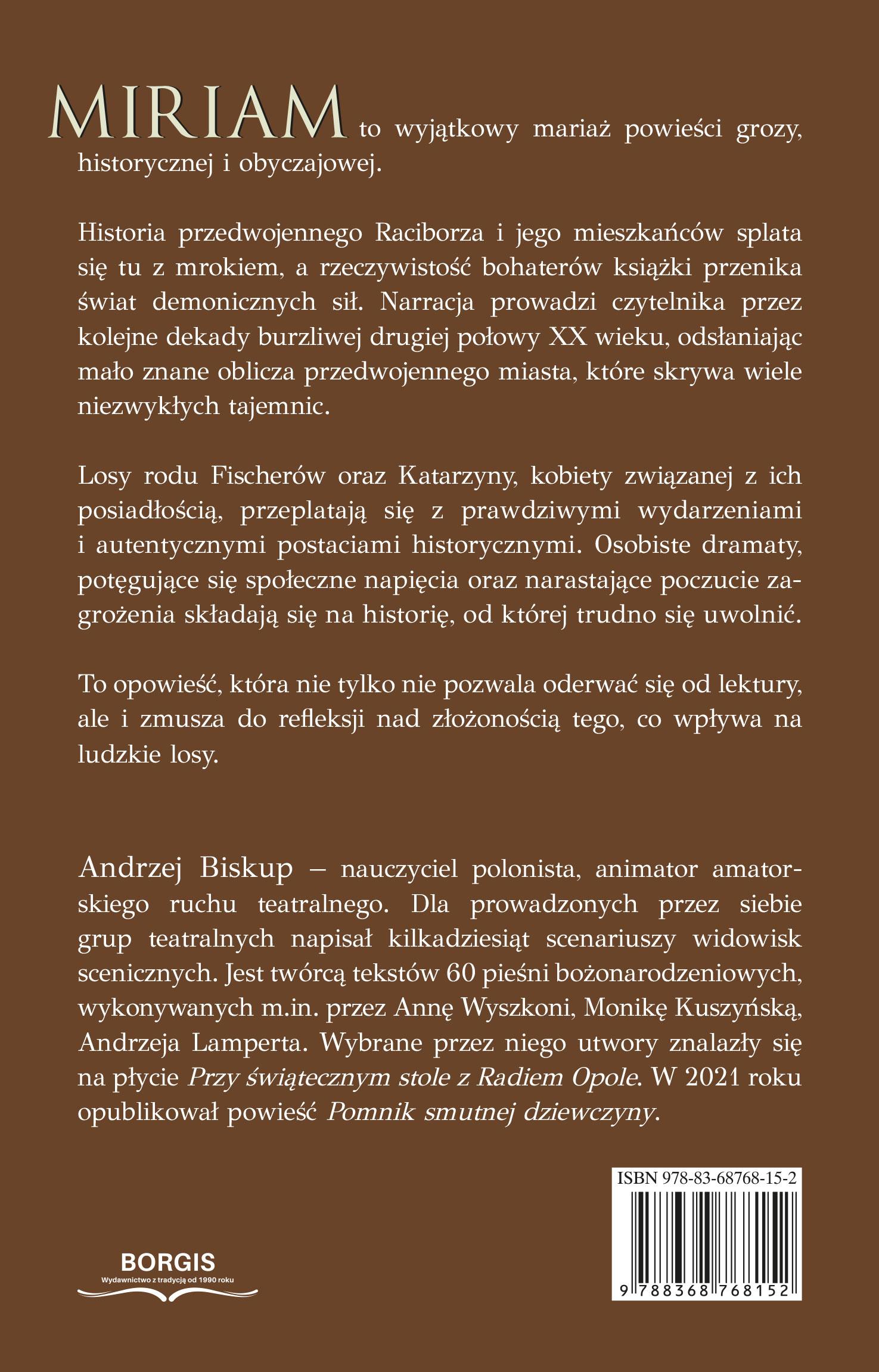 Powieść „Miriam” Andrzeja Biskupa to powieść historyczna wywołująca skrajne emocje. Akcja dzieje się w Raciborzu i okolicach. Narracja prowadzi przez burzliwe dekady drugiej połowy XX wieku. Historia miasta i mieszkańców splata się z mrokiem i tajemnicą. Siły wymykające się racjonalnemu porządkowi świata przenikają codzienność bohaterów. Losy rodu Fischerów i Katarzyny łączą się z autentycznymi wydarzeniami i postaciami historycznymi. Przeszłość wpływa bezpośrednio na teraźniejszość, skłaniając do refleksji nad odpowiedzialnością, pamięcią i dziedziczeniem win. Książka „Miriam” posiada potencjał sprzedażowy dzięki uniwersalnej tematyce, silnemu lokalnemu zakorzenieniu i rosnącemu zainteresowaniu ambitną polską powieścią historyczną.Szczegółowe informacje na temat książki Miriam