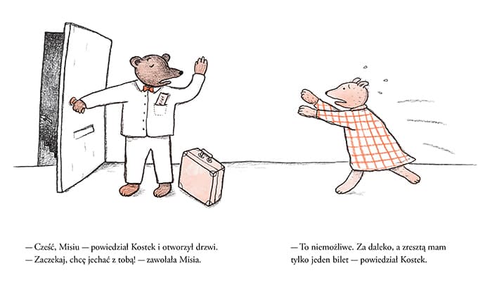 Misia i Kostek mieszkają razem w jednym domu. Zwykle przed południem piją kawę. Robią tak od zawsze. Aż pewnego dnia Kostek oświadcza, że wyjeżdża w daleką podróż. Nawet nie pyta, czy Misia chciałaby pojechać z nim. Misia zostaje sama. Targają nią silne emocje. Złość. Tęsknota. Poczucie odrzucenia. Smutek. Rozpacz. W końcu jednak Misia próbuje odbudować swoją codzienność. Co będzie, jak Kostek wróci? Pierwsza część kilkutomowego cyklu o Misi i Kostku niezwykle cenionej szwedzkiej autorki i ilustratorki Anny Höglund. Te obrazkowo-słowne historie to lustro relacji - przede wszystkim napięcia pomiędzy pragnieniem bycia razem i potrzebą osobności. Opisane w nich emocje rozpoznają zarówno dzieci, jak i dorośli, przy czym każdy będzie mógł je odnieść do siebie na miarę własnego doświadczenia życiowego. Annę Höglund znamy w Polsce z przejmującej książki obrazkowej dla nastolatków „O tym można rozmawiać tylko z królikami”, a także z ilustracji do książek Ulfa Starka: „Czy umiesz gwizdać, Joanno?” i „Chłopiec, dziewczynka i mur”.
