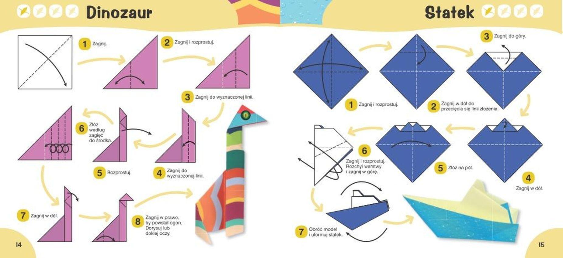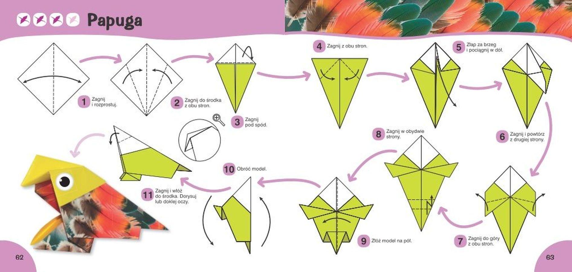 4 stopnie TRUDNOŚCI 65 nowych MODELI 248 STRON PAPIERÓW do składania Szczegółowe INSTRUKCJE KROK PO KROKU opatrzone ilustracjami „Modele origami” to książka, która zawiera NIEBANALNE projekty o RÓŻNYM STOPNIU TRUDNOŚCI. Poszczególne etapy realizacji każdego modelu są SZCZEGÓŁOWO WYTŁUMACZONE i ZILUSTROWANE krok po kroku. Dzięki książce KAŻDY będzie mógł własnoręcznie złożyć PIESKA, SMOKA czy ODRZUTOWIEC. Atutem książki są ZDJĘCIA rzeczywistych gotowych modeli oraz dołączone KOLOROWE KARTKI stanowiące materiał do wykonania zabawek z papieru Książka • rozwija WYOBRAŹNIĘ PRZESTRZENNĄ • ćwiczy SPRAWNOŚĆ I PRECYZJĘ MANUALNĄ • doskonali zdolność LOGICZNEGO MYŚLENIA • trenuje PAMIĘĆ i umiejętność koncentracji ORIGAMI Seria książek dla hobbystów składania origami. Prowadzi Czytelnika krok po kroku, zagięcie po zagięciu, od najprostszych, przez średnio trudne, do skomplikowanych modeli.