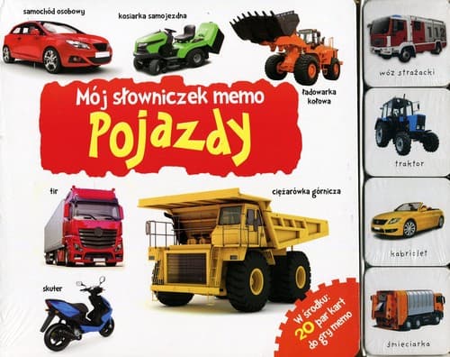 Sztywnostronicowe książki ze zdjęciami i podpisami, do których dołączono 20 par kart do gry w memo. Dzięki nim dzieci z łatwością nauczą się nowych wyrazów z różnych dziedzin, poszerzą słownictwo i utrwalą nowe słówka podczas zabawy. W serii: Zwierzęta, Pojazdy, Na wsi