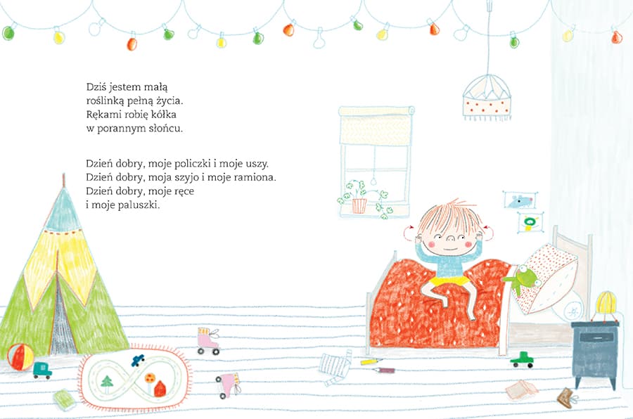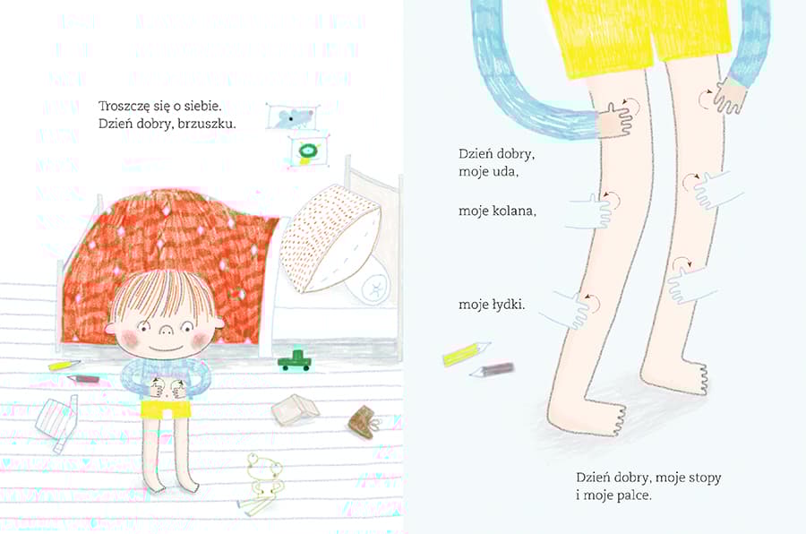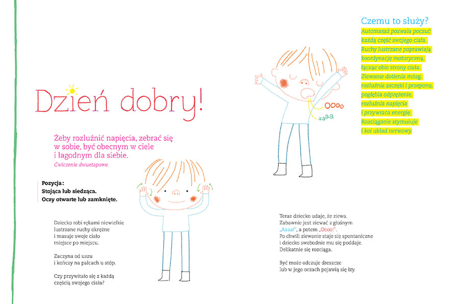 "Cztery relaksacje słowno-ruchowe, które pomogą dziecku odprężyć się i dobrze poczuć tu i teraz oraz w dłuższej perspektywie. Opis każdej relaksacji zawiera: • część informacyjną dla rodzica, czyli wyjaśnienie celu i przebiegu relaksacji oraz opis ruchu, jaki ma wykonywać dziecko • część praktyczną do pracy z dzieckiem, czyli tekst z ilustracjami do wspólnego czytania, oglądania i praktykowania. Ćwiczenia są proste i przyjemne, dzięki czemu dziecko szybko je zapamięta. Przyswojone sekwencje ruchowe pomogą mu zrelaksować się w ciągu dnia, pogłębić wewnętrzne zaufanie, rozluźnić napięcia w ciele, pobudzić energię i zachować równowagę. Wspólne chwile odprężenia dzieci i rodziców to wspaniała praktyka. Poczujcie, jak pozytywnie wpływa ona zarówno na ciało, jak i na ducha, i przekonajcie się, że będzie procentować przez całe życie! Anne Crahay inspiruje się stworzoną w latach 80. XX wieku metodą edukacyjną Brain Gym®, która łączy procesy myślowe (brain) z ciałem (gym) i bazuje na przyjemności uczenia się w ruchu. Książka powstała we współpracy z Marie-Anne Saive, specjalistką kinezjologii edukacyjnej i metody Brain Gym®."