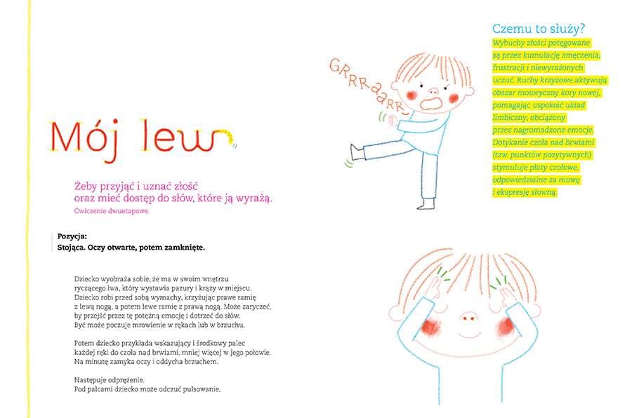 "Cztery relaksacje słowno-ruchowe, które pomogą dziecku wyrazić swoją złość i przez nią przejść. Opis każdej relaksacji zawiera: • część informacyjną dla rodzica, czyli wyjaśnienie celu i przebiegu relaksacji oraz opis ruchu, jaki ma wykonywać dziecko • część praktyczną do pracy z dzieckiem, czyli tekst z ilustracjami do wspólnego czytania, oglądania i praktykowania. Ćwiczenia są proste i przyjemne, dzięki czemu dziecko szybko je zapamięta. Przyswojone sekwencje ruchowe pomogą mu na co dzień uznawać, wyrażać i uspokajać swoją złość. Wspólne chwile odprężenia dzieci i rodziców to wspaniała praktyka. Poczujcie, jak pozytywnie wpływa ona zarówno na ciało, jak i na ducha, i przekonajcie się, że będzie procentować przez całe życie! Anne Crahay inspiruje się stworzoną w latach 80. XX wieku metodą edukacyjną Brain Gym®, która łączy procesy myślowe (brain) z ciałem (gym) i bazuje na przyjemności uczenia się w ruchu. Książka powstała we współpracy z Marie-Anne Saive, specjalistką kinezjologii edukacyjnej i metody Brain Gym®."