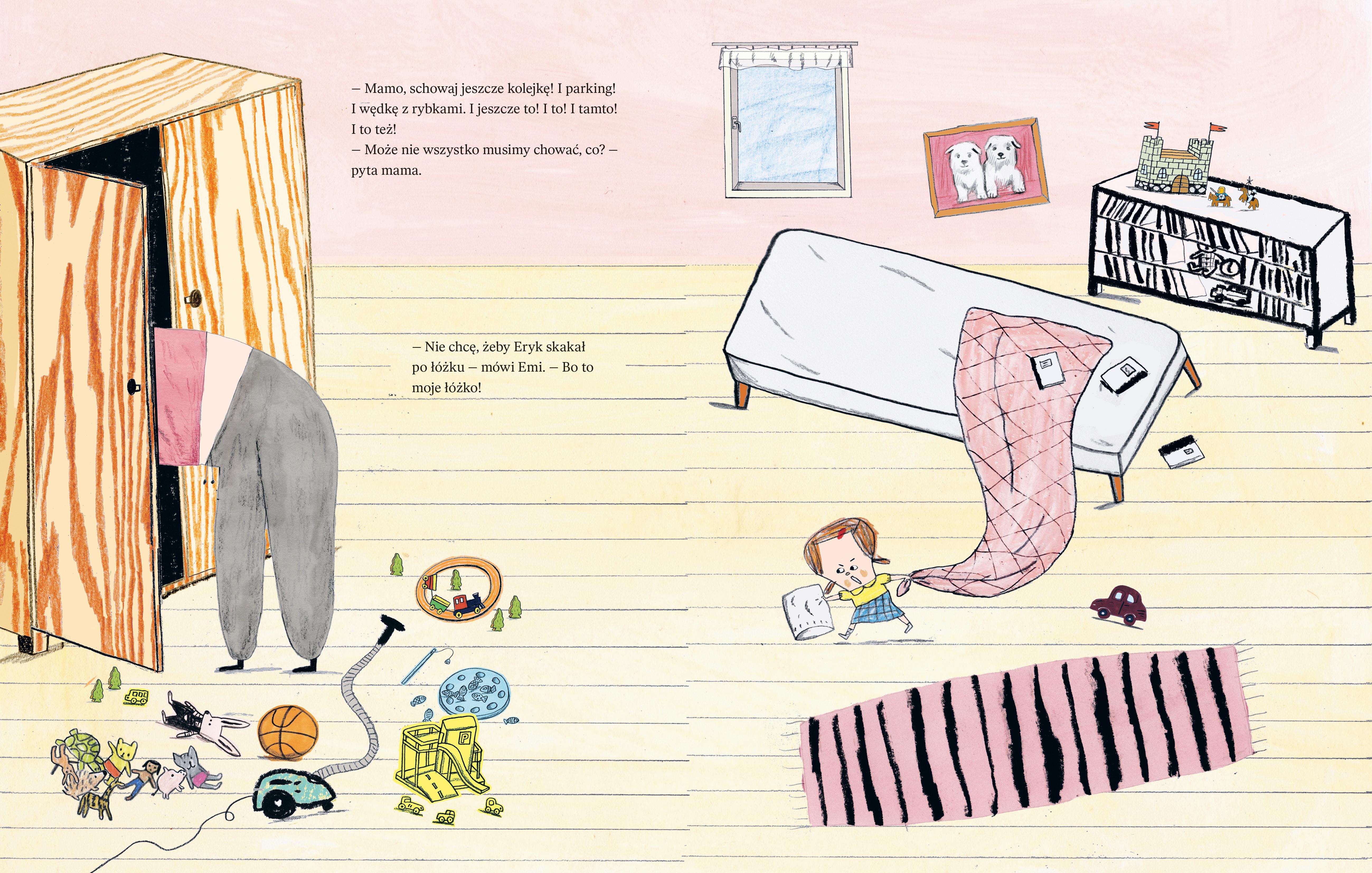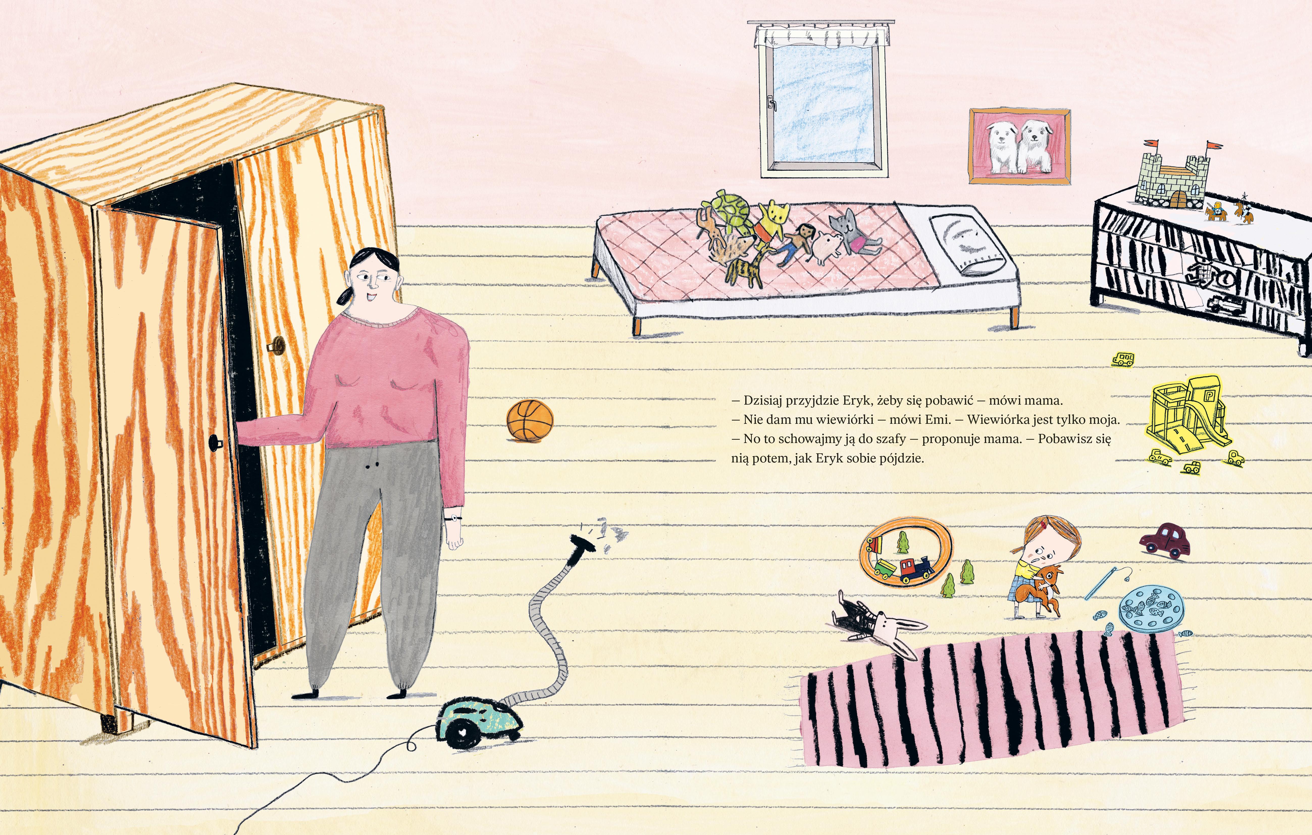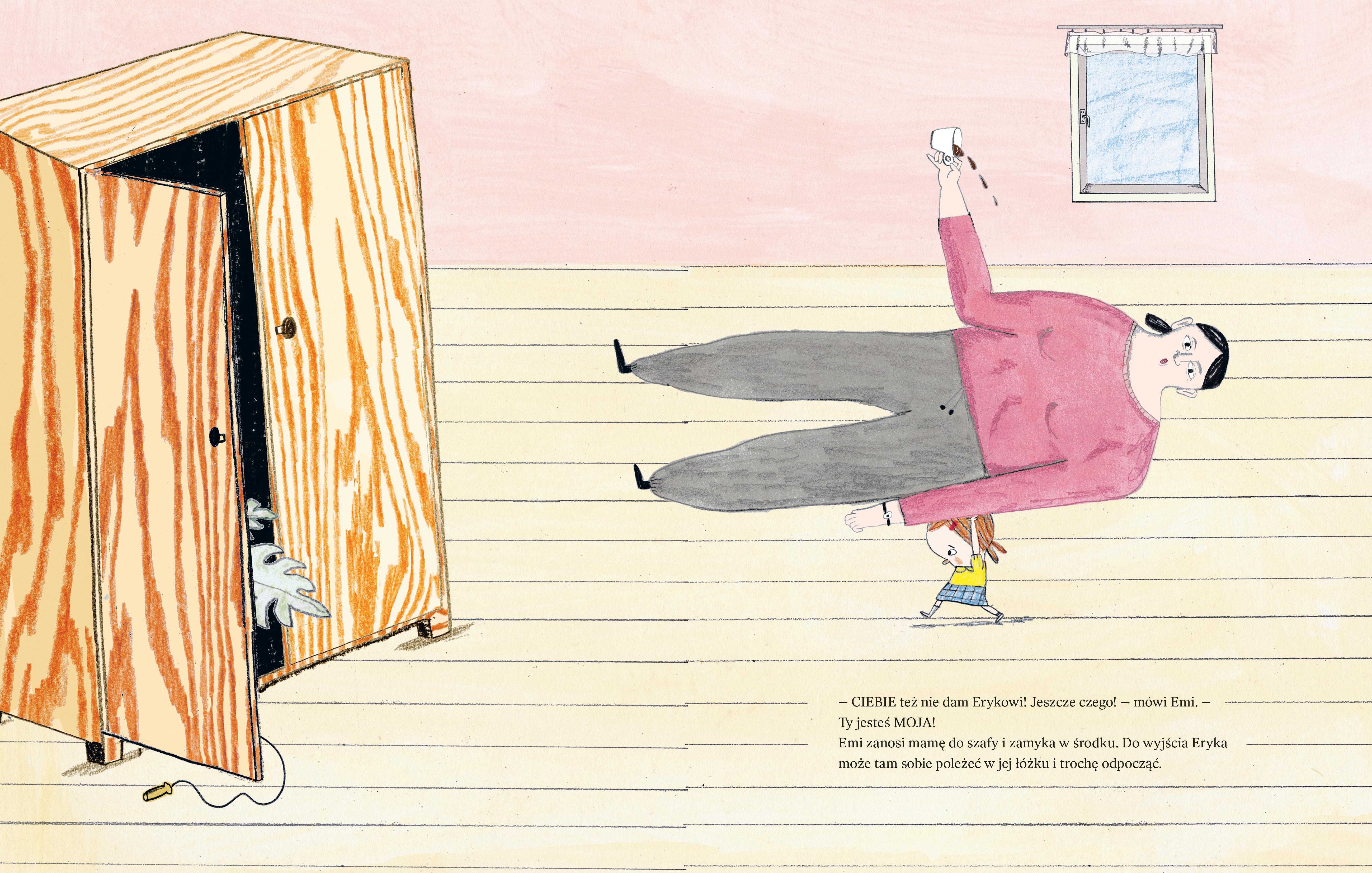 Do Emi ma przyjść kolega. Zaraz u niej będzie! Zanim zapuka do drzwi, Emi musi szybko schować do szafy swoją ulubioną maskotkę. I inne ulubione zabawki. Właściwie to wszystkie są ulubione! I jeszcze mamę, bo mamą też nie zamierza się z nikim dzielić! Kiedy szafa pęka w szwach, Emi jest gotowa na przyjęcie gościa i zabawę. Ale to nie koniec tej na wskroś autentycznej, a zarazem absurdalnej i prześmiesznej historii! Jak daleko Emi posunie się w swojej zaborczości i niechęci do dzielenia się i co z tego ostatecznie wyniknie? Klara Persson, ceniona i nagradzana autorka i ilustratorka młodego pokolenia, zaprosiła do współpracy przy tej książce starszą koleżankę po fachu, Charlotte Ramel, której powierzyła zilustrowanie swojego tekstu. Kreskę tej ostatniej polscy czytelnicy znają m.in. z książek o Cynamonie i Trusi czy z kartonówek z serii Co Wokoło.
