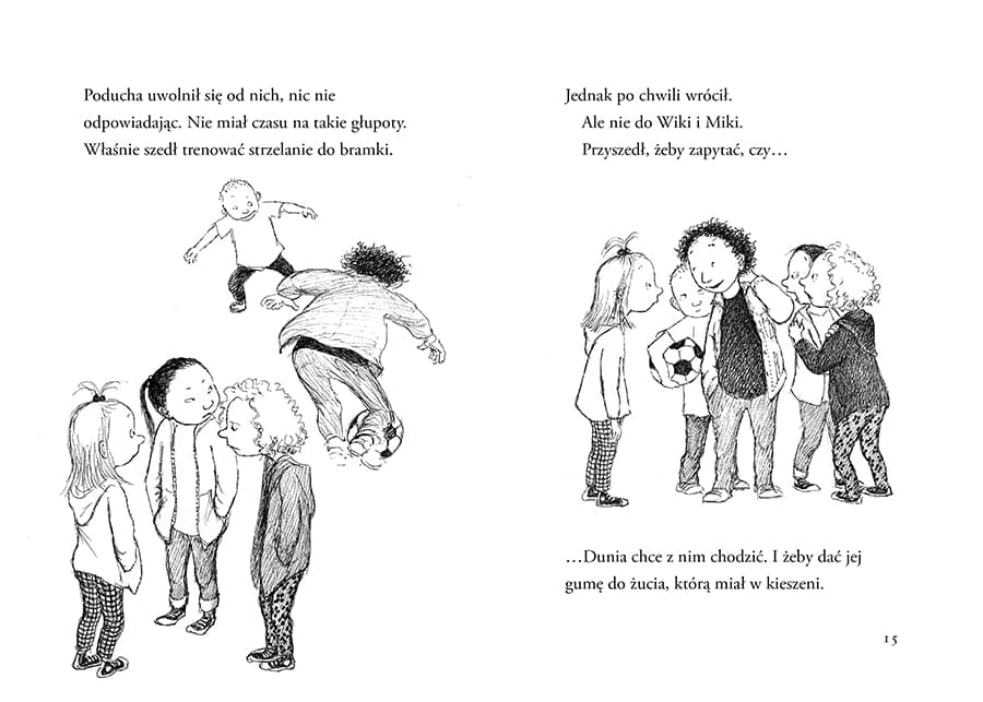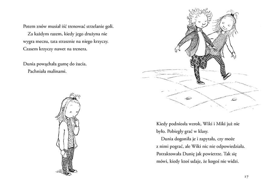 Znów będzie o Duni. Tej, która jest taka szczęśliwa! Ale ostatnio Dunia ze smutkiem patrzy na puste krzesło obok w ławce. Siedziała na nim Frida, zanim wyprowadziła się do Uppsali. Dunia nie pozwala nikomu zająć tego miejsca, bo gdzie usiądzie Frida, kiedy wróci? - Frida nie wróci - próbuje jej tłumaczyć pani. - Nigdy nic nie wiadomo - szepcze Dunia. Bo Dunia nigdy nie traci nadziei, nawet jeśli wszystko wydaje się beznadziejne… O przyjemnych, ale też trudnych chwilach w szkole i wśród rówieśników z perspektywy pierwszoklasistki. W sam raz dla początkujących czytelników nie tylko ze względu na treść, ale i formę. Czytanie ułatwiają prosty język, duża czcionka, przejrzysty układ strony i świetne rysunki Evy Eriksson. O Duni przeczytacie również w książce „Moje szczęśliwe życie”.