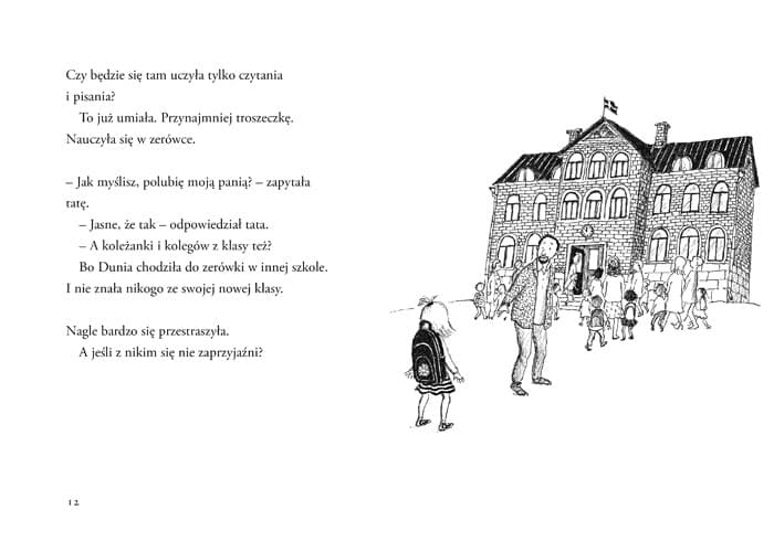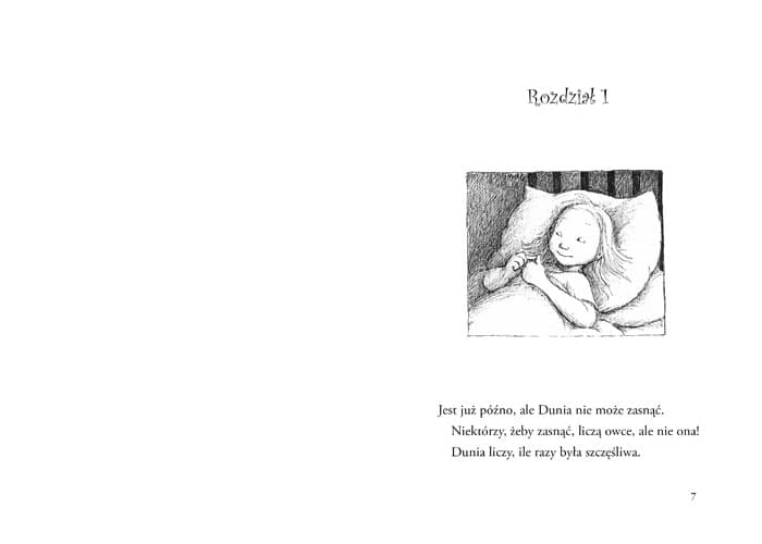 Dunia zawsze marzyła o tym, żeby pójść do szkoły. Ale kiedy nadchodzi ten moment, zaczyna się niepokoić. Bo co będzie, jeśli nie zaprzyjaźni się z nikim w swojej klasie? W nocy przed pierwszym dniem szkoły Dunia nie może zasnąć. Tata mówi, żeby liczyła owce. Ale Dunia postanawia policzyć wszystkie te razy, kiedy była szczęśliwa. Ciekawe, jaki będzie jutrzejszy dzień! Pogodna opowieść o szkole i przyjaźni z perspektywy pierwszoklasistki - w sam raz dla początkujących czytelników nie tylko ze względu na treść, ale i formę. Czytanie ułatwiają prosty język, duża czcionka, przejrzysty układ strony i świetne rysunki Evy Eriksson.
