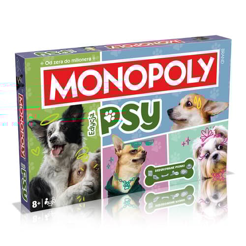 MONOPOLY PSY – Przygoda w świecie czworonożnych przyjaciół! Psy to wierni towarzysze i najlepsi przyjaciele człowieka, którzy zasługują na swoją wyjątkową edycję MONOPOLY! Jeśli kochasz czworonogi, ta gra jest właśnie dla Ciebie. Wybierz jeden z kolekcjonerskich pionków – kość, miskę, smaczki, pieska, pogryziony but lub legowisko – i ruszaj na przygodę w świecie naszych przyjaciół. Kupuj psie domki i hotele, odwiedzaj weterynarza i groomera, sięgaj po karty „Zabawek” lub „Smakołyków” i spróbuj zostać najlepszym psim opiekunem! Owczarek niemiecki, chihuahua, husky syberyjski – to tylko niektóre z ras, które możesz zdobyć. Czy uda Ci się zdominować planszę i pokonać przeciwników? Zasady gry Każdy gracz wybiera pionek i otrzymuje banknoty w różnych nominałach. Grę rozpoczyna osoba, która wyrzuci najwyższą liczbę oczek na kostce. Celem jest zdobycie jak największej fortuny poprzez zakup i rozwój psich lokalizacji. Pamiętaj, że jeśli wejdziesz na pole należące do innego gracza, będziesz musiał zapłacić. Zwycięża ten, kto jako ostatni pozostanie na planszy z pieniędzmi, doprowadzając innych do bankructwa. Zawartość pudełka Plansza do gry, 6 kolekcjonerskich pionków, 28 kart Tytuł Własności, 16 kart Zabawki, 16 kart Smakołyki, Zestaw banknotów Monopoly, 2 kostki, 32 domki, 12 hoteli, Instrukcja. Specyfikacja Liczba graczy: 2-6, Wiek: 8+, Czas gry: 1-3 godziny, Język wydania: polski. Uwaga! Produkt nieodpowiedni dla dzieci poniżej 3. roku życia.