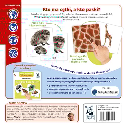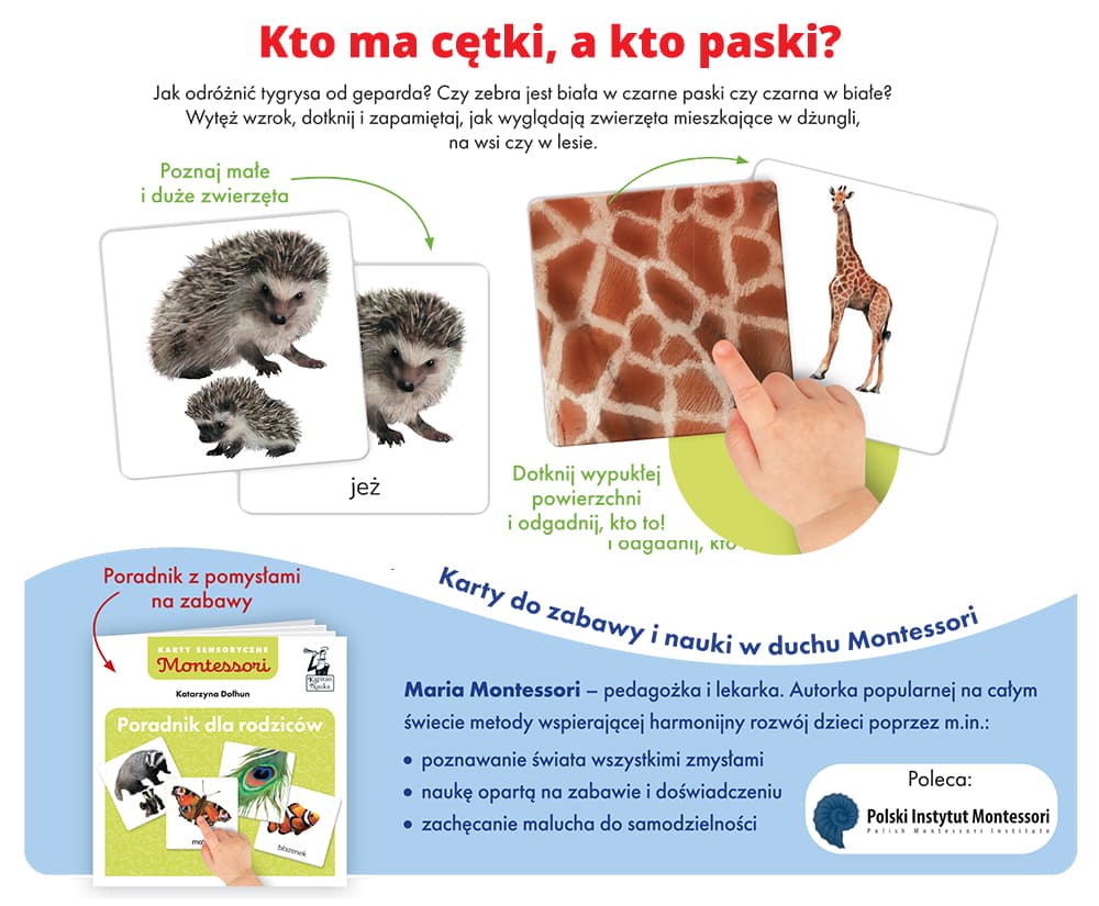Kto ma cętki, a kto paski? Jak odróżnić tygrysa od geparda? Czy zebra jest biała w czarne paski czy czarna w białe paski? Twoje dziecko obserwuje i poznaje zwierzęta oraz dotyka wypukłych elementów. Możecie bawić się z maluchem na wiele sposobów. Oglądajcie zwierzęta i czytajcie podpisy pod obrazkami. Łączcie zwierzęta i ich młode w rodziny, dopasujcie zwierzaki do ich umaszczenia, opisujcie ich wygląd i zgadujcie, co jedzą, gdzie mieszkają oraz jakie mają zwyczaje. W zestawie: 34 realistycznie ilustrowane, dwustronne karty poradnik dla rodziców z pomysłami na wspólne zabawy z kartami Okiem eksperta Montessori wierzyła, że dzieci lubią być blisko natury. Dlatego zachęcajmy je do spotkań z przyrodą, które będą angażować zmysły wzroku, dotyku, słuchu i węchu, oraz do zabaw z pomocami takimi jak te karty. Przedstawione na nich realistyczne ilustracje stanowią doskonałe uzupełnienie wiedzy o otaczającym świecie. Joanna Maghen – założycielka i dyrektorka Polskiego Instytutu Montessori, prezeska Polskiej Rady Montessori Karty sensoryczne poleca: Polski Instytut Montessori Metoda Montessori powstała w wyniku długoletnich obserwacji rozwoju małych dzieci. Jej autorką jest Maria Montessori, włoska pedagożka i pierwsza w historii Włoch lekarka. Podstawowe zasady metody to m.in.: poznawanie świata wszystkimi zmysłami, nauka oparta na zabawie i doświadczeniu, rozwój samodzielności. Zestaw został wyprodukowany w Polsce z najwyższą troską o bezpieczeństwo najmłodszych. Autorzy Katarzyna Dołhun – dyrektor pedagogiczny przedszkola językowego, metodyk, certyfikowany nauczyciel pedagogiki Marii Montessori, lektor języka angielskiego i niemieckiego. Katarzyna Fus – urodzona w 1991 roku. Ukończyła Akademię Sztuk Pięknych w Krakowie. Z wykształcenia graficzka i architektka wnętrz. Z zamiłowania ilustratorka.