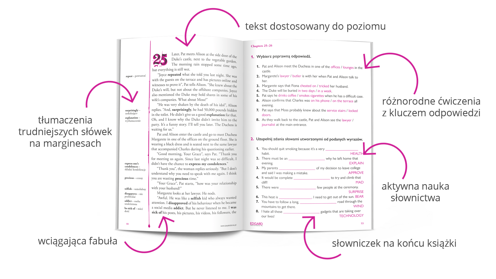 - sprawdzaj znaczenie słów, nie odrywając się od lektury dzięki tłumaczeniom na marginesach,