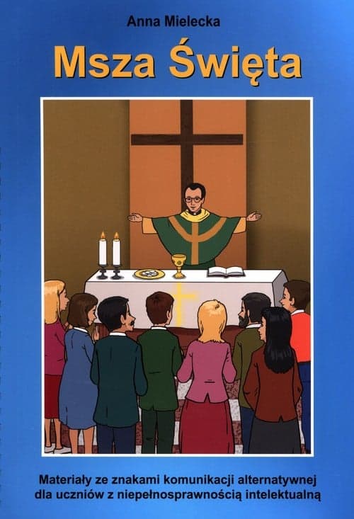 "Msza Święta" - materiały edukacyjne do katechezy dla uczniów z umiarkowaną i znaczną niepełnosprawnością intelektualną „Msza Święta” to kolejna po „Spotykam Jezusa” publikacja przeznaczona dla uczniów z niepełnosprawnością intelektualną w stopniu umiarkowanym i znacznym oraz osób posługujących się alternatywnymi i wspomagającymi metodami komunikacji. Proste ilustracje i opisy dotyczące poszczególnych elementów Mszy Świętej pozwalają uczniom poznać przebieg Eucharystii. Znaki komunikacji alternatywnej PCS pomagają uporządkować pojęcia bazowe związane z uczestniczeniem w liturgii. Książka wprowadza do świadomego udziału we Mszy Świętej. Może być wykorzystana na lekcjach, jak również w kościele, gdzie pomoże uczniowi śledzić przebieg liturgii. Zawarte w niej treści z czasem powinny być rozszerzane i pogłębiane w miarę nabywania przez uczniów wiedzy i umiejętności. Książka - przewodnik po Mszy Świętej dla uczniów z umiarkowaną i znaczną niepełnosprawnością intelektualną. Może być używany podczas lekcji religii, a także w domu i w kościele. Ilustracje dostosowane do możliwości percepcyjnych osób z niepełnosprawnością intelektualną, tekst łatwy do czytania oraz znaki komunikacji alternatywnej PCS (Picture Communication Symbols) pozwalają uczniom poznać poszczególne części Mszy Świętej.