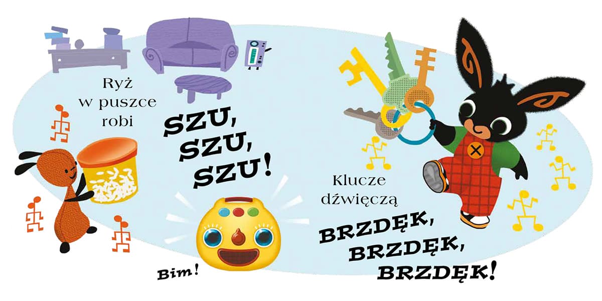 Bing to bohater ciepłych, mądrych i pełnych uroku opowieści Teda Dewana, na podstawie których powstał serial uwielbiany przez maluchy na całym świecie. Bing. Muzyka to wielka rzecz! to książka, w której czarny króliczek uczy się, że muzyka jest wokół nas. Bing i Flop używają codziennych przedmiotów, takich jak dzwonek, tuba, puszka z ryżem, czy klucze i poznają świat dźwięków. Przekonaj się razem z nimi, że w zwykłych przedmiotach też kryje się muzyka, potrzeba tylko trochę wyobraźni, żeby ją wydobyć. Opowieść o dźwiękach ukrytych w przedmiotach to doskonały punkt wyjścia do rozmów z maluchem o jego (lub jej) własnych przygodach. Mała i lekka książeczka z powodzeniem zmieści się do dziecięcego plecaka, dzięki czemu młody czytelnik może mieć ją przy sobie wszędzie tam, gdzie dopadnie go nuda. Książka ma duże, piękne ilustracje stworzone przez Teda Dewana, a proste i pełne uroku teksty zrozumieją nawet najmłodsze dzieci.